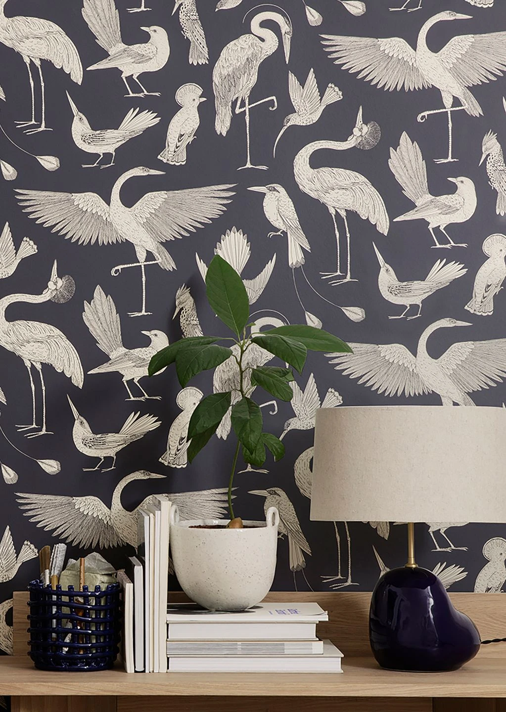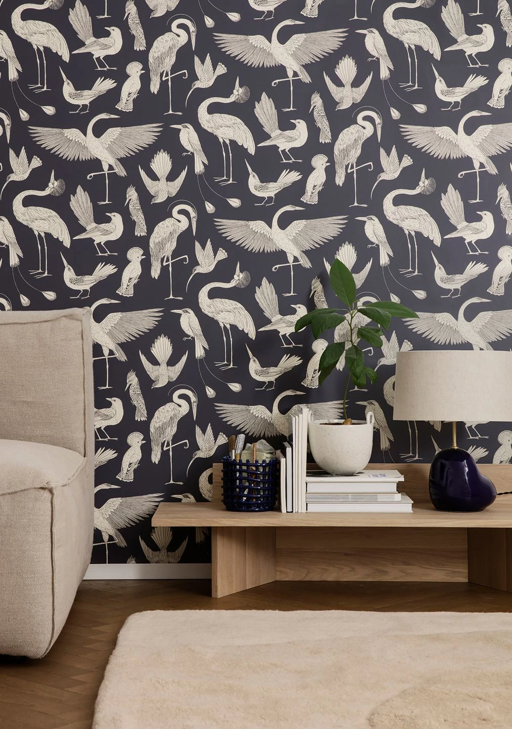 Kraniche breiten ihre Flügel aus, Reiher stehen elegant auf einem Bein, Paradiesvögel zeigen ihre schmückenden Schwanzfedern. Die schier unglaubliche Artenvielfalt der Vogelwelt bereichert Ihren Raum mit der Vliestapete „Birds of Happiness“ von Ferm Living. Den anatomisch korrekten, detailreichen Zeichnungen der Vögel, ganz in Cremeweiß und Anthrazit gehalten, steht der elegante dunkelblaue Untergrund entgegen, der einen Ruhe spendenden Rahmen bildet.