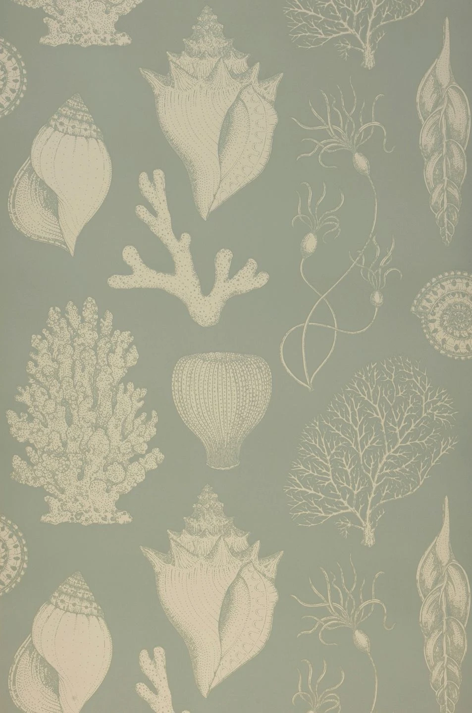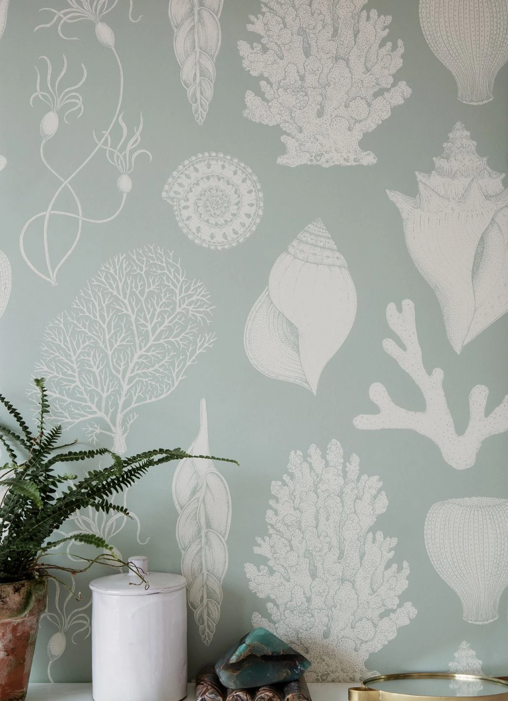 Ganz sanft präsentiert sich die Schönheit der Unterwasserwelt. Korallen, Muscheln und andere Meeresbodengewächse entzücken das Auge. Pastellgrün bildet das Meerwasser ab, die fein gezeichneten Elemente in Weiß rücken zart in den Vordergrund.