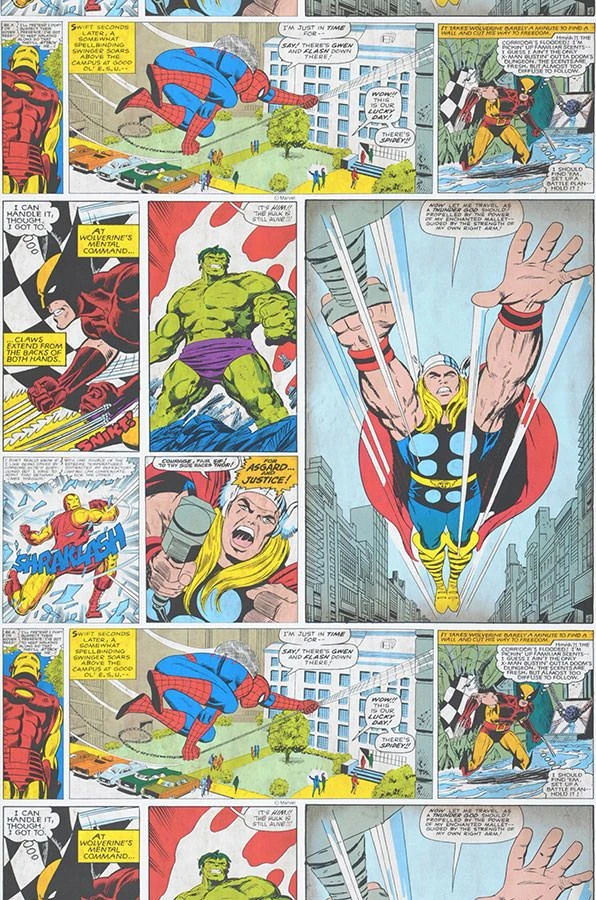Eine Wand voller Comics – da ist Langeweile von vornherein ausgeschlossen! Einzelne Bilder aus den legendären Marvel-Comics der 60er Jahren erzählen Momente aus den Abenteuern von Spiderman, dem unglaublichen Hulk, Thor und den X-Men. Die lebhaft bunten Bilder sind eine tolle Kulisse für ein Kinder- oder Jugendzimmer, aber auch für einen erwachsenen Comic-Fan. Und so ganz nebenbei schnappt man beim Lesen der englischen Texte in den Sprechblasen noch die eine oder andere Vokabel auf!