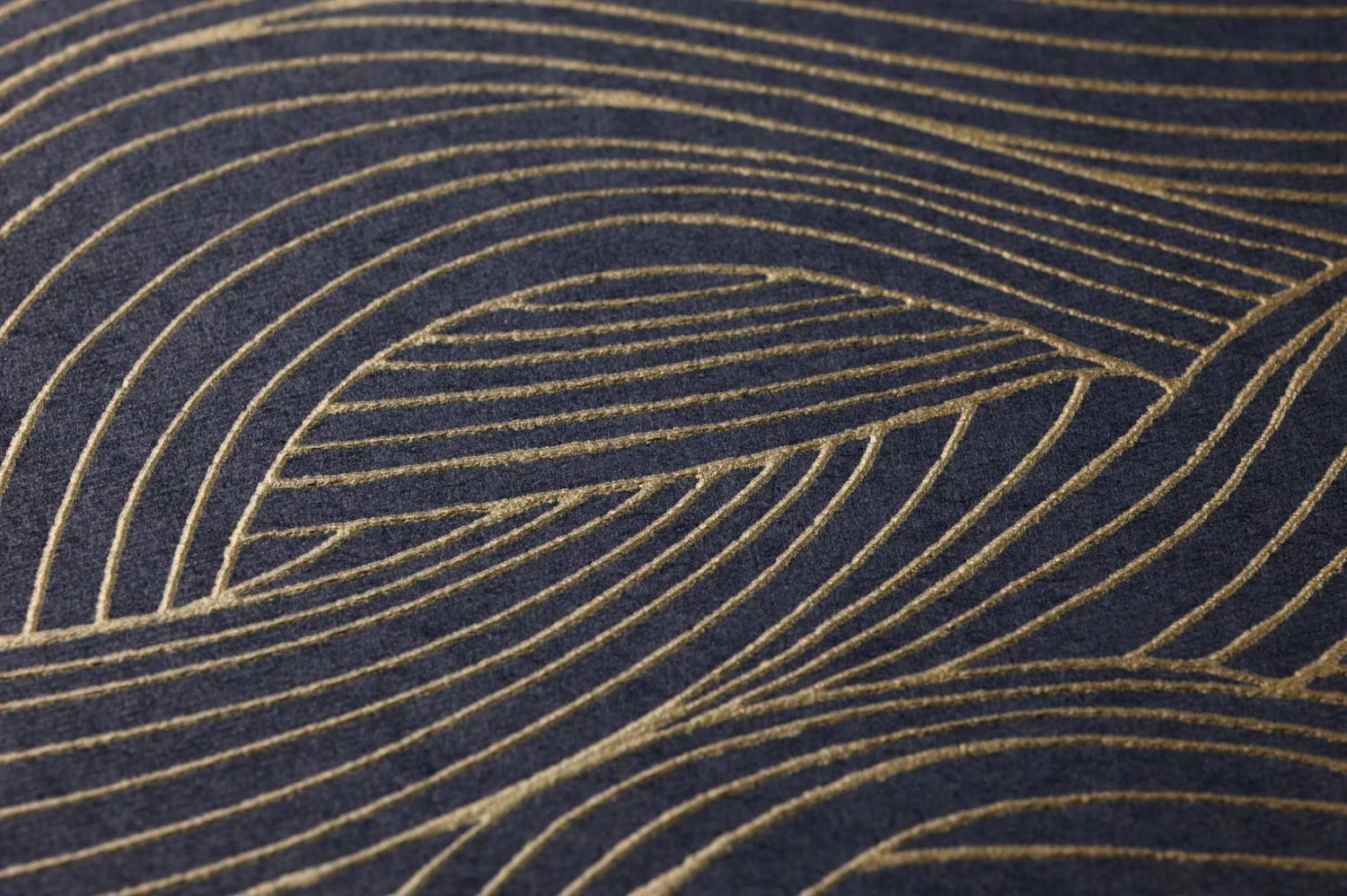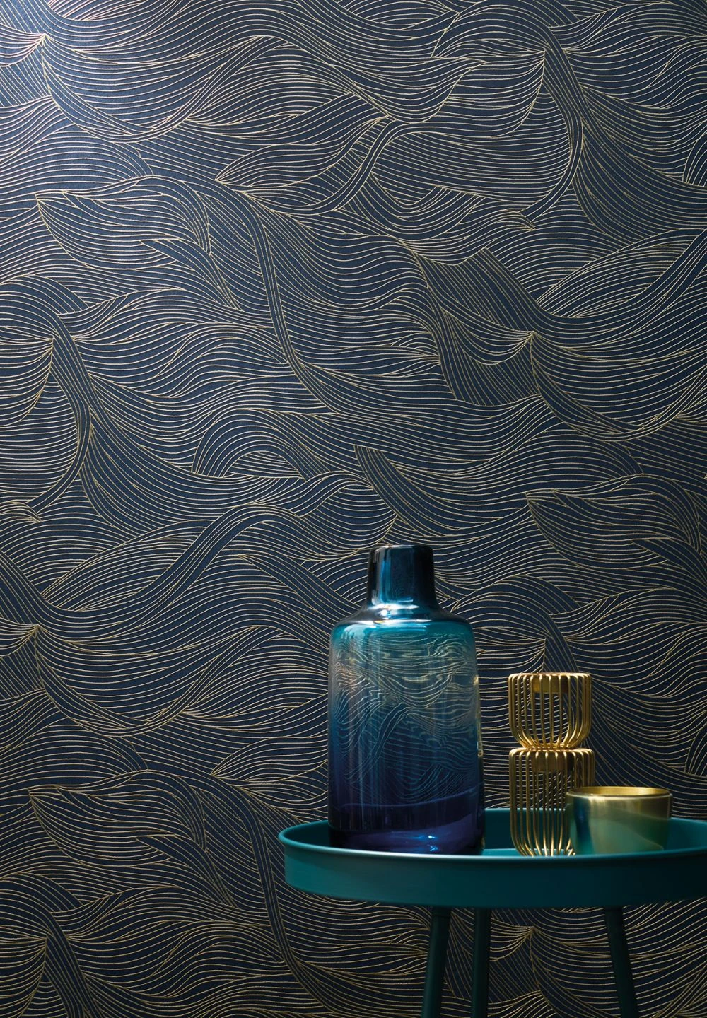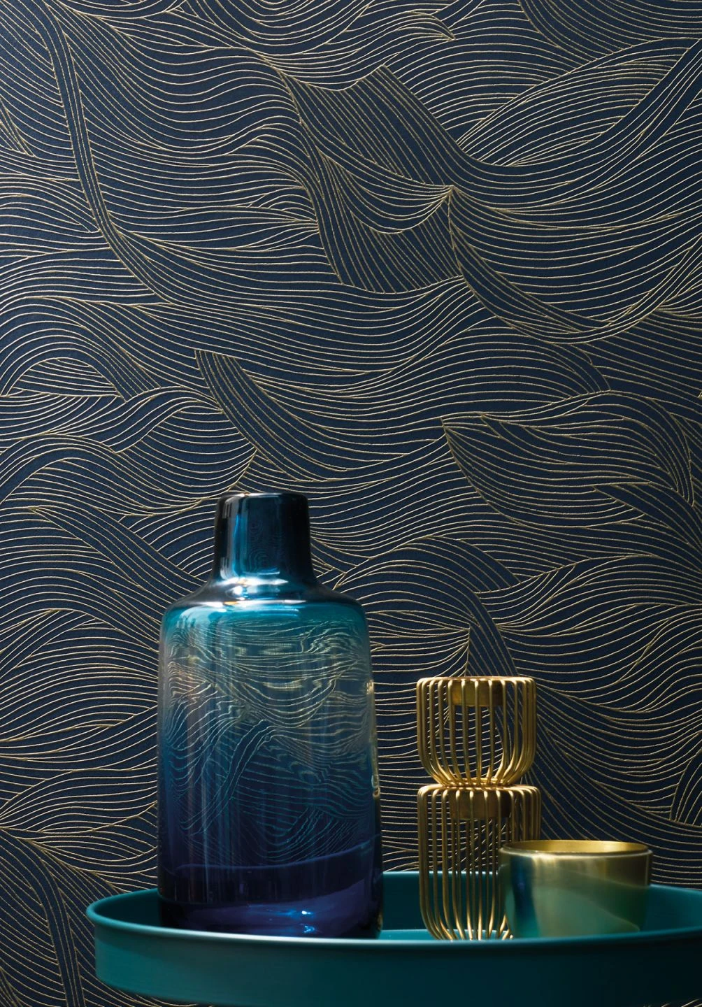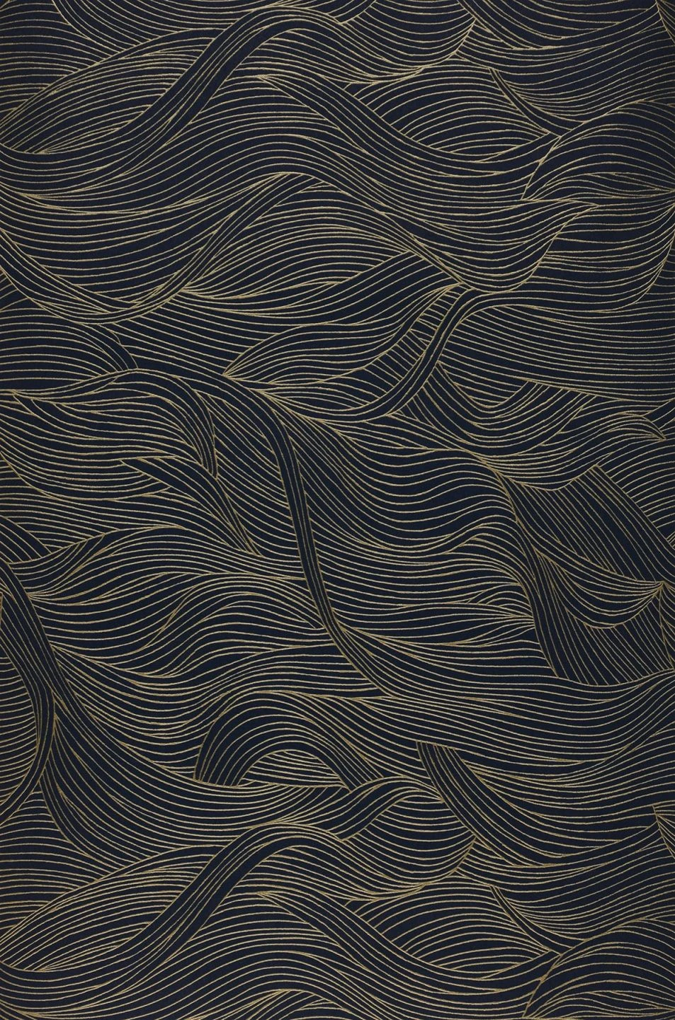 Schwungvolle Linien aus schimmernder Goldfarbe wurden so großzügig auf den dunkelblauen Grund aufgebracht, dass sie fühlbar erhaben hervortreten. Das orientalisch anmutende Muster setzt sich zu Wellenbergen und Tälern zusammen, so als würde man auf das von Wind und Gezeiten bewegte Meer blicken. Kostbar und zeitlos wirkt die Farbkombination von dunklem Blau und Gold.