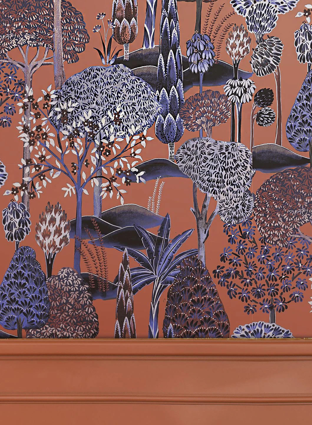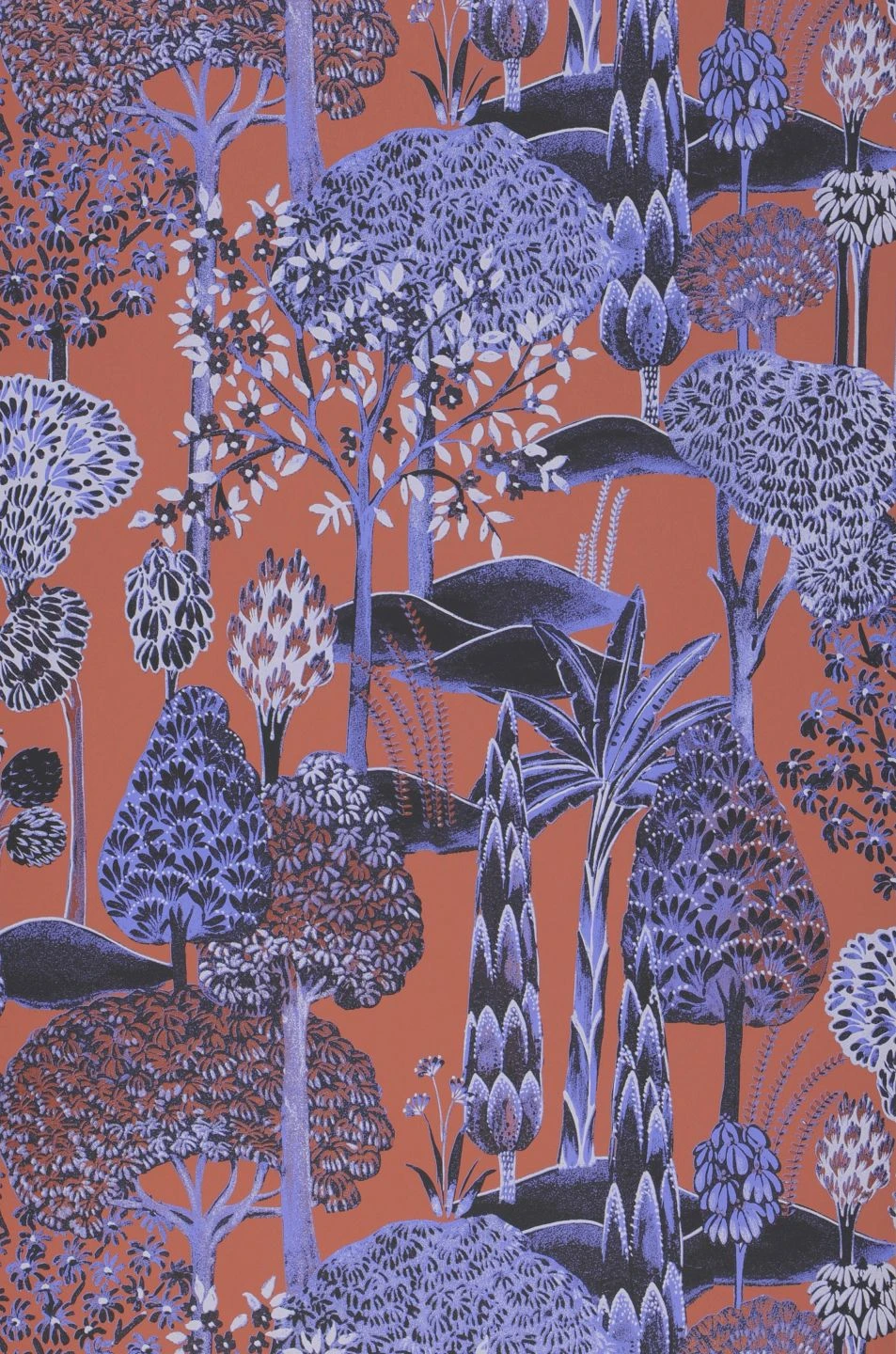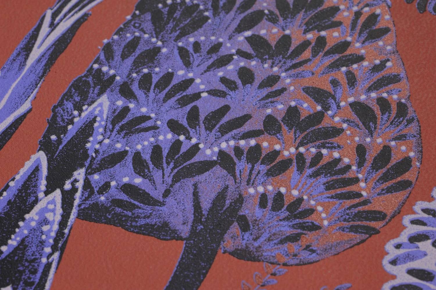Warmes Kupferbraun und Blauviolett ergeben eine intensiv glühende Farbkombination, von der ein besonderer Zauber ausgeht. So wirkt der Laubwald, dessen Bäume noch durch Details in Perlkupfer belebt werden, geheimnisvoll und lebendig. Die verschiedenen Formen der Bäume und Blätter machen die Tapete zu einem abwechslungsreichen Hintergrund für Ihren Raum, der toll mit dunklen, warmen Erdfarben zu kombinieren ist.