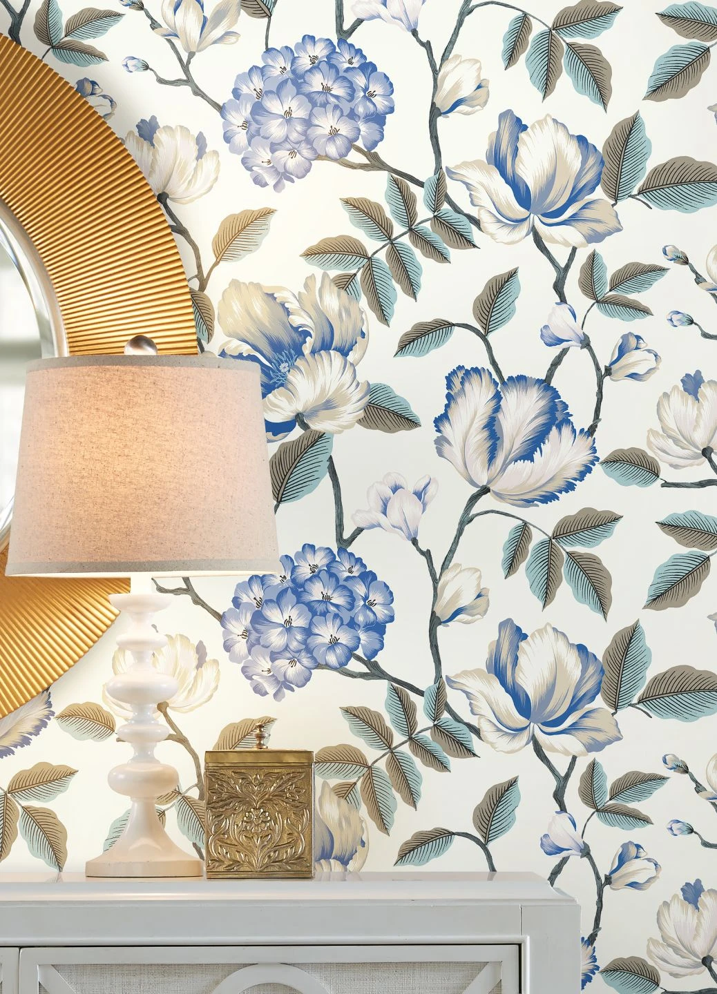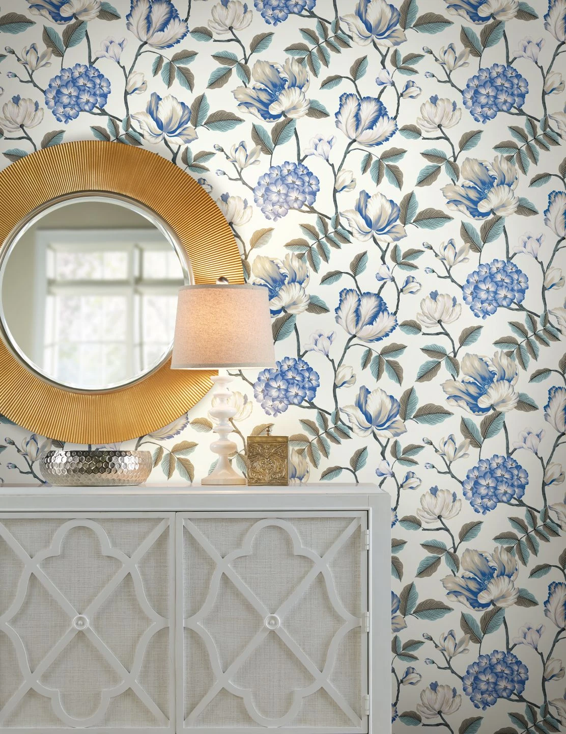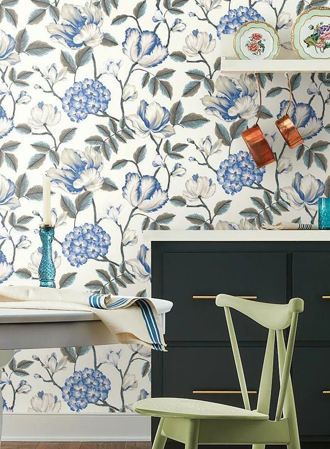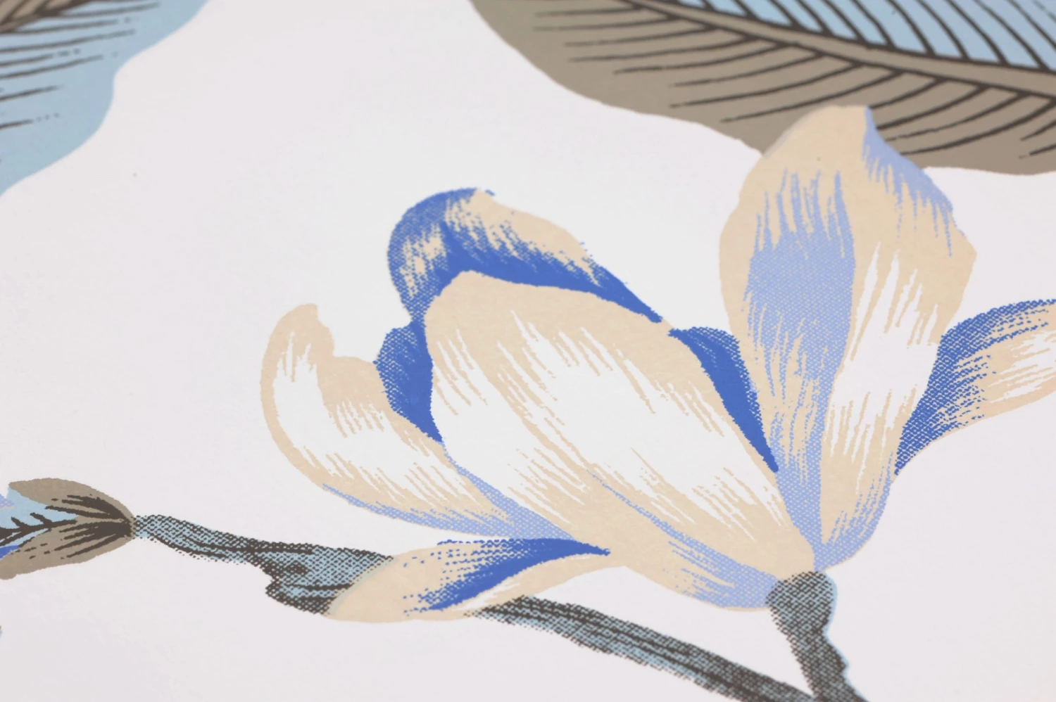 Hortensien mit ihren halbkugelförmigen Dolden von kleinen Blüten, ausladende Mohnblumen und sich eben öffnende Knospen der Magnolie bilden ein traumhaftes Ensemble von Blütenranken an Ihrer Wand. Der weiße Untergrund und die Farbverläufe der Blüten zwischen Weiß, hellem Elfenbein und Blautönen erzeugen duftige Frische. Das locker arrangierte Blumenmuster der Tapete Alba bringt Leichtigkeit in Ihre Küche, Ihr Schlafzimmer oder Ihr Wohnzimmer.