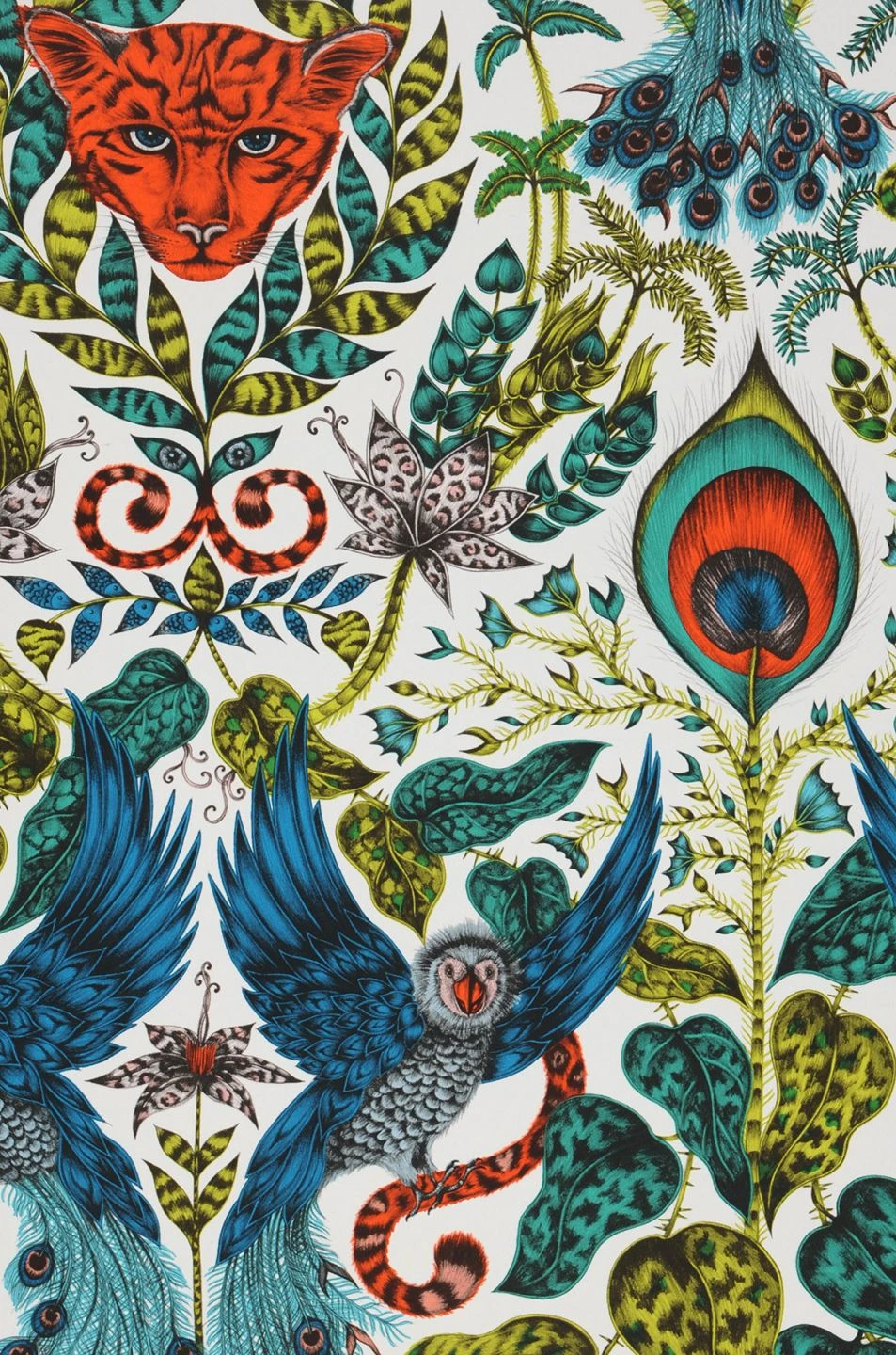 Wilde Exotik aus einer neuen Perspektive: Design Tapete Amazon bedient sich an prägnanten Motiven des Dschungels und setzt diese in einen gelungenen Musterkontext. Pfauenauge, Paradiesvögel und Leopardenkopf verschmelzen mit tropischen Blumenranken zu einer geheimnisvollen surreal wirkenden Einheit. (Jaime)