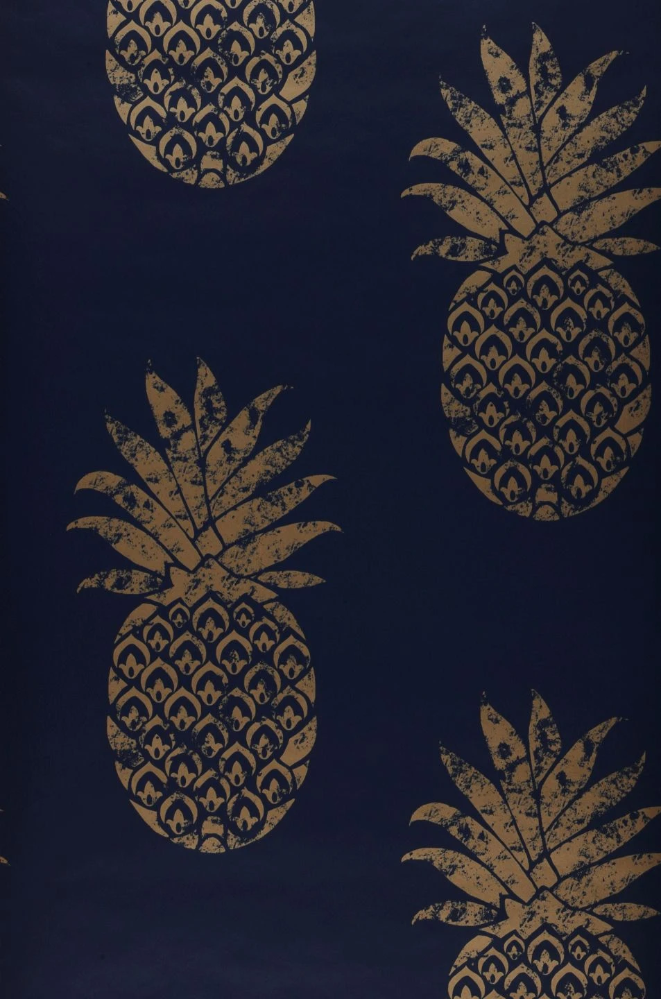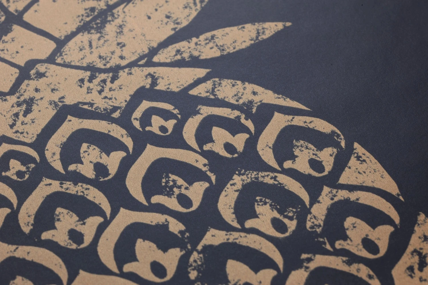 Die Verbindung von Blau und Gold steht für königliche Eleganz. Die schimmernd goldfarbenen Ananas auf dem tief saphirblauen Grund erhalten durch den Farbauftrag, der wie mit Stofffarben gestempelt anmutet, eine erfrischende Leichtigkeit. Die stilisierten Früchte erinnern an Ethno-Print-Muster auf traditionell hergestellten Stoffen und spenden Ihrem Raum einen Hauch von Luxus und eine Portion Exotik.
