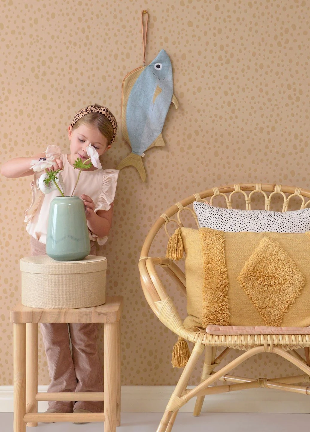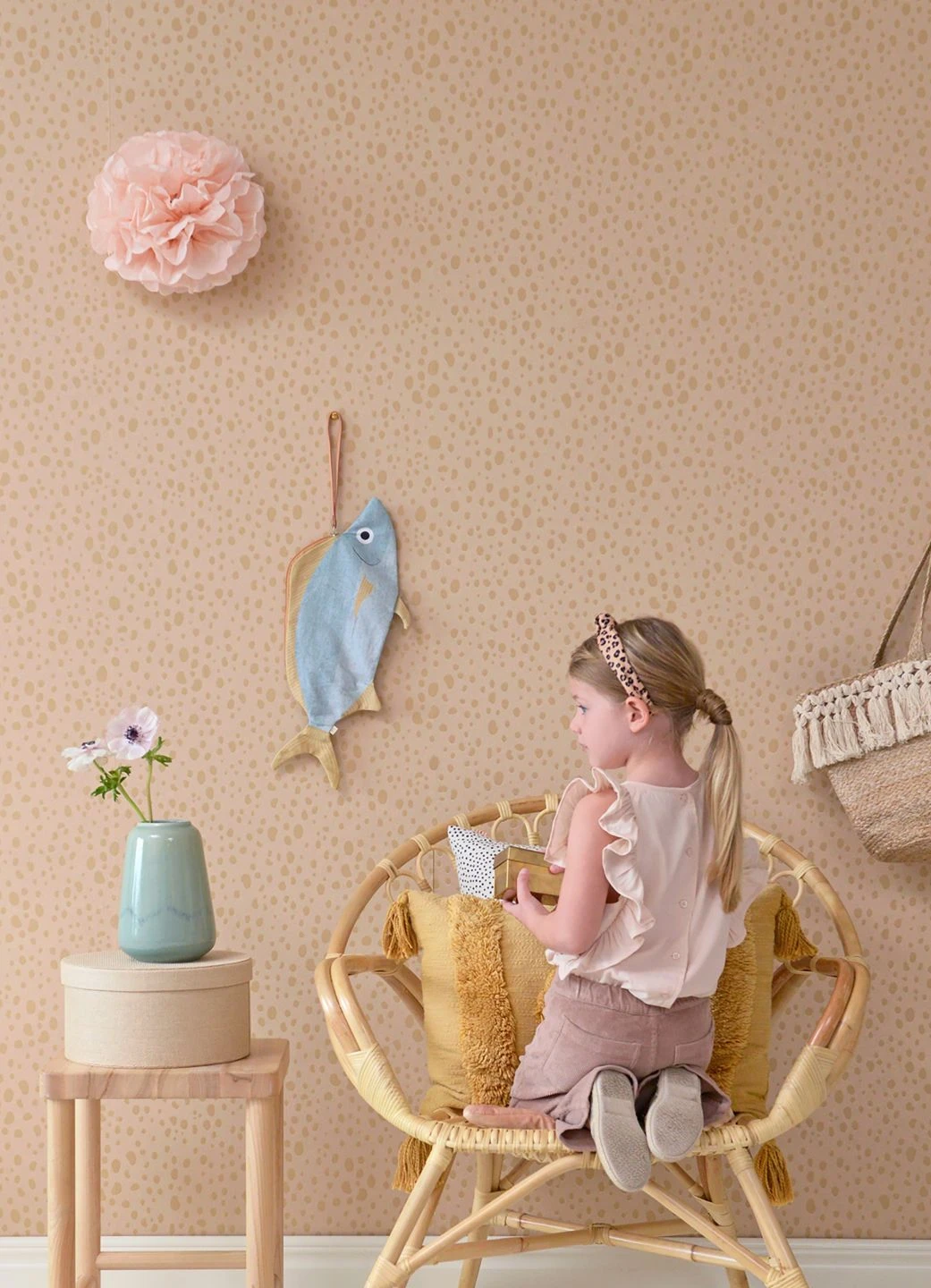 Übersät mit unregelmäßigen Flecken wie das Fell einer Raubkatze ist die effektvolle Kinderzimmer-Tapete „Animal Dots“ von der schwedischen Designerfirma Majvillan. Die braunbeigefarbenen Tupfen auf dem blassen pastellorangefarbenen Untergrund strahlen warme Geborgenheit, aber gleichzeitig auch einen Hauch von exotischer Safari-Atmosphäre aus. So lädt der Wandschmuck dazu ein, spielerisch die tollsten Abenteuer zu erleben.