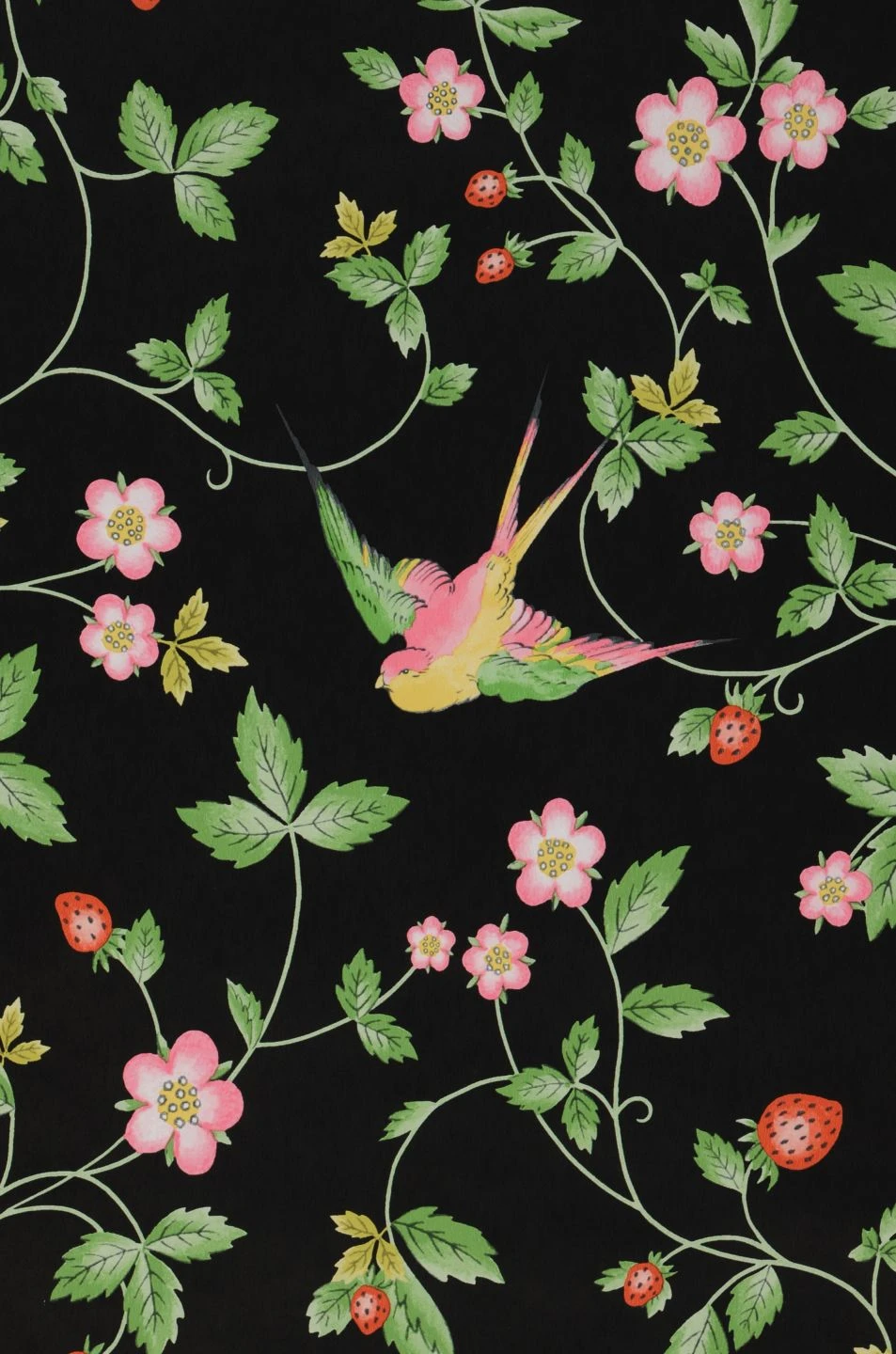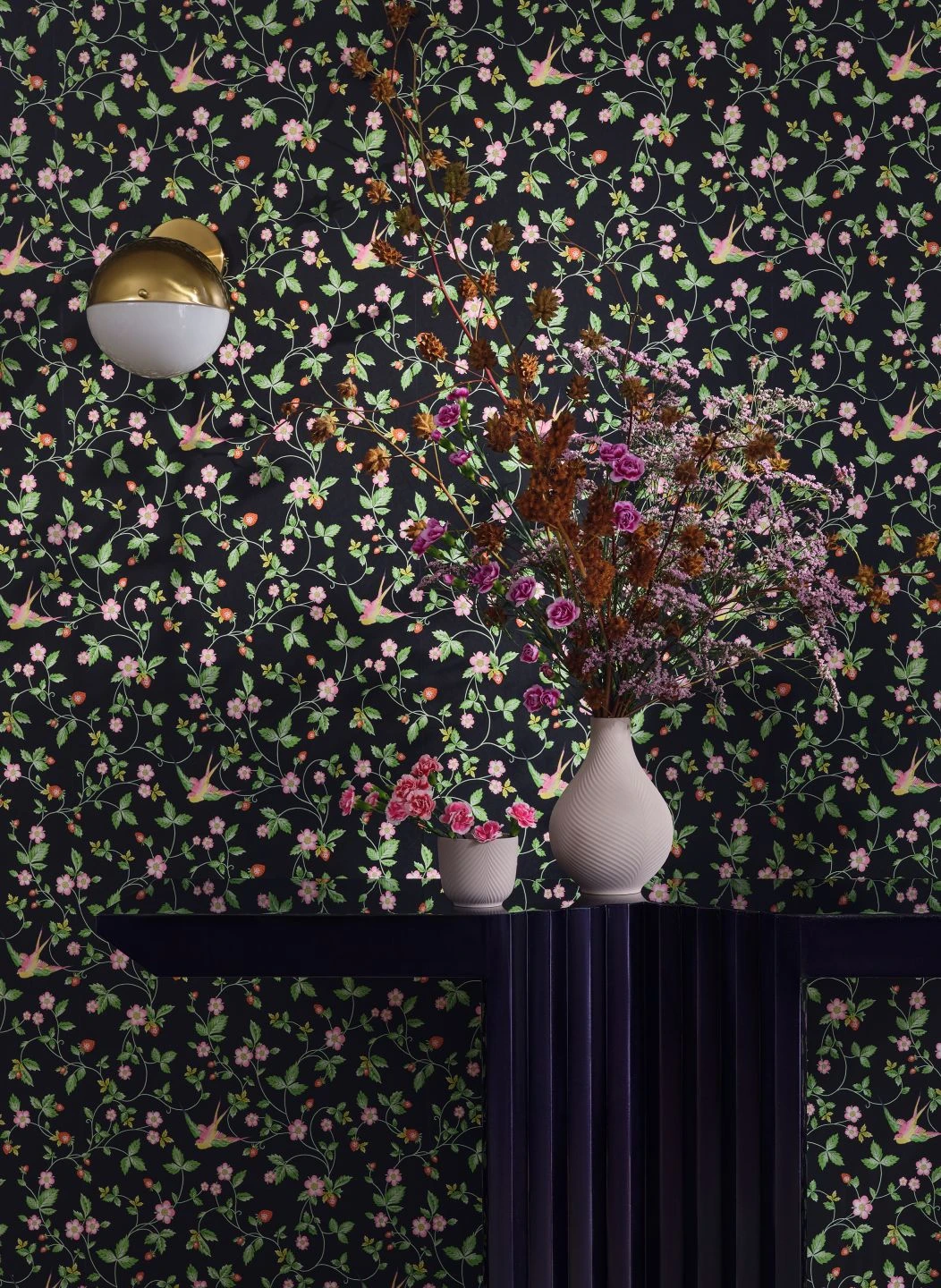 Wie Juwelen leuchten die reifen roten Erdbeeren, ihre zarten Blüten und die grünen Erdbeerblätter aus dem schwarzen Untergrund der Tapete hervor. Doch der eigentliche Clou sind die Schwalben mit ihrem Gefieder in bunten Bonbonfarben! Übersät mit den Blüten und Früchten, wird Ihre Wand zu einer echten Attraktion. Mit einer der Musterfarben, schwarzen oder weißen Elementen unterstreichen Sie die Wirkung der Tapete perfekt.