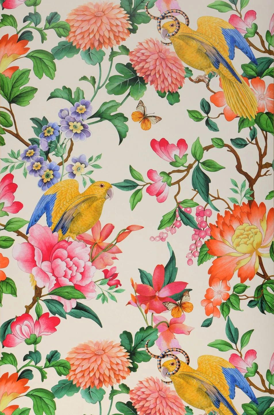 Eine bunte tropische Welt voller blühender Blumen, sonnengelber Vögel und flatternder Schmetterlinge verzaubert Ihre vier Wände. Der cremeweiße Grund lässt die Rot-, Blau- und Grüntöne fast plastisch aus der Fläche der Tapete hervortreten. Lebhaft sind nicht nur die leuchtenden Farben, sondern auch die natürlich wirkende Haltung der exotischen Vögel. Ihr ganz persönliches Tropen-Paradies lädt zu Entspannung und guter Laune ein.