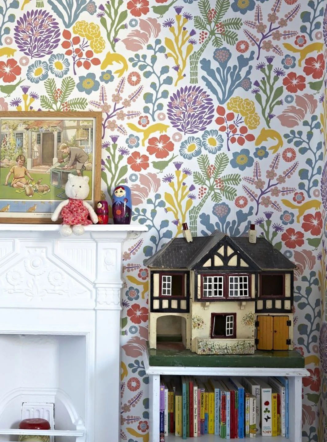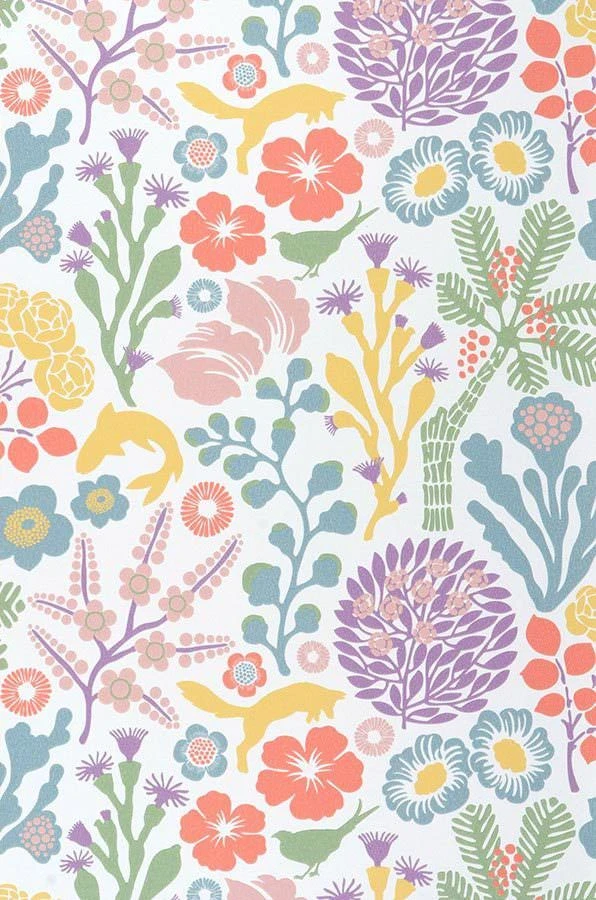 Abstrakte Blütenformen, zwischen denen sich Tiere verstecken, sowie leuchtende Farben wie Grün, Rot und Violett auf weißen Grund verleihen dieser Tapete eine besondere Originalität.