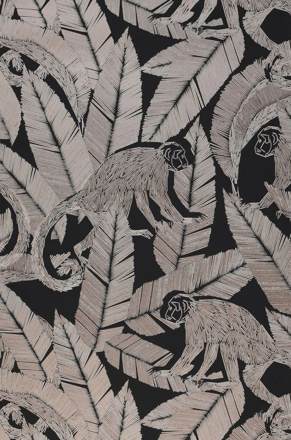 Schimmernd setzen sich die Musterfarben Grauweiss und Perlbeige vom tiefschwarzen Untergrund ab. Eine clevere Linienführung erschafft Blätter, hinter denen sich die putzigen Totenkopfäffchen zu verstecken scheinen. Gestalten Sie Akzentwände im kolonialen Südamerika Stil und lassen Sie die exotische Welt Brasiliens mit dieser glamourösen Tapete erstrahlen.