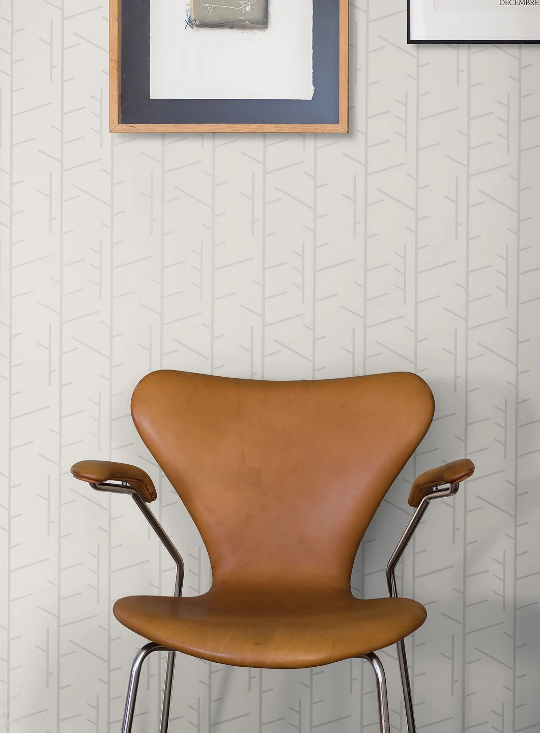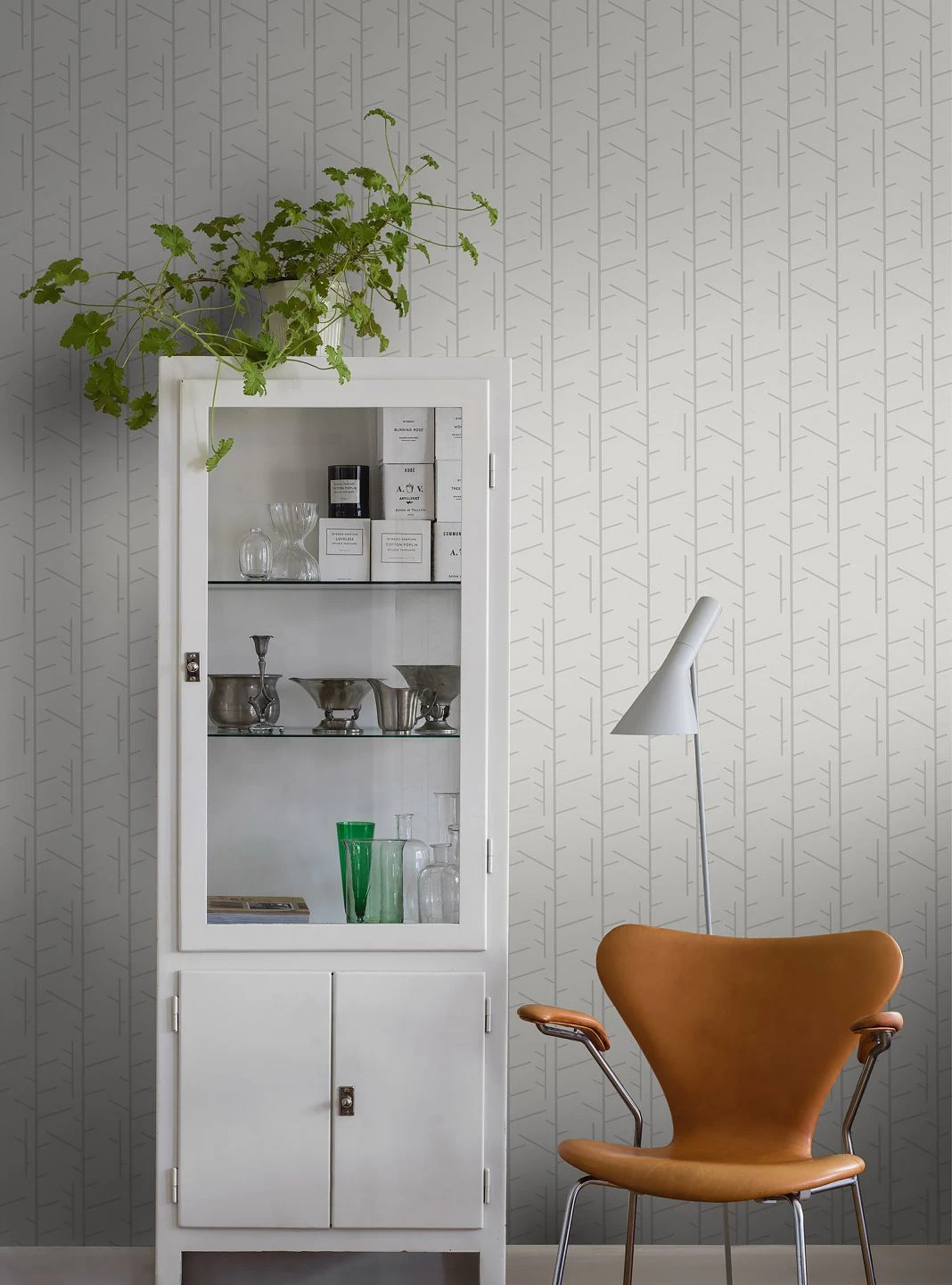 Vliestapete Arne hält sich vornehm im Hintergrund und hat doch einen ganz eigenen Charakter. Auf dem weißgrauen Untergrund formen lange, schmale Streifen und schräge Verzweigungen stilisierte Bäume mit Ästen und Zweigen. Das geradlinige Muster und die zwei hellen Grautöne lassen sich vielseitig kombinieren, passen besonders schick zu weißen oder hellgrauen Möbeln und sorgen dafür, dass selbst ein kleines Zimmer offen und lichtdurchflutet wirkt.