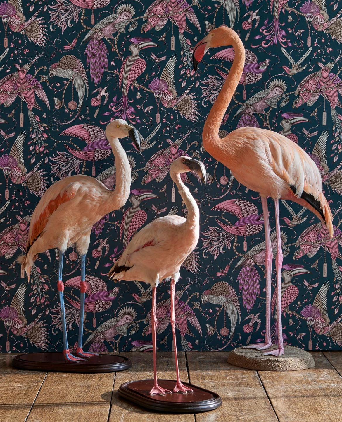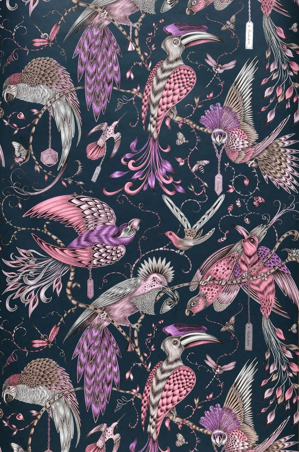 Ausdrucksstark und geheimnisvoll eröffnet die exotische Romantiktapete mit tropischen Paradiesvögeln in Blassbraun, Rosa, Silber Schimmer und Violett der geflügelten Fantasie alle Türen. Die Schönheit der Musterfarben erhält durch dunkles Ozeanblau intensive Tiefe. In Ruheräumen oder als repräsentatives Kunstwerk an ausgewählten Wandflächen genießt die hochwertige Vliestapete volle Aufmerksamkeit. (Volturi)