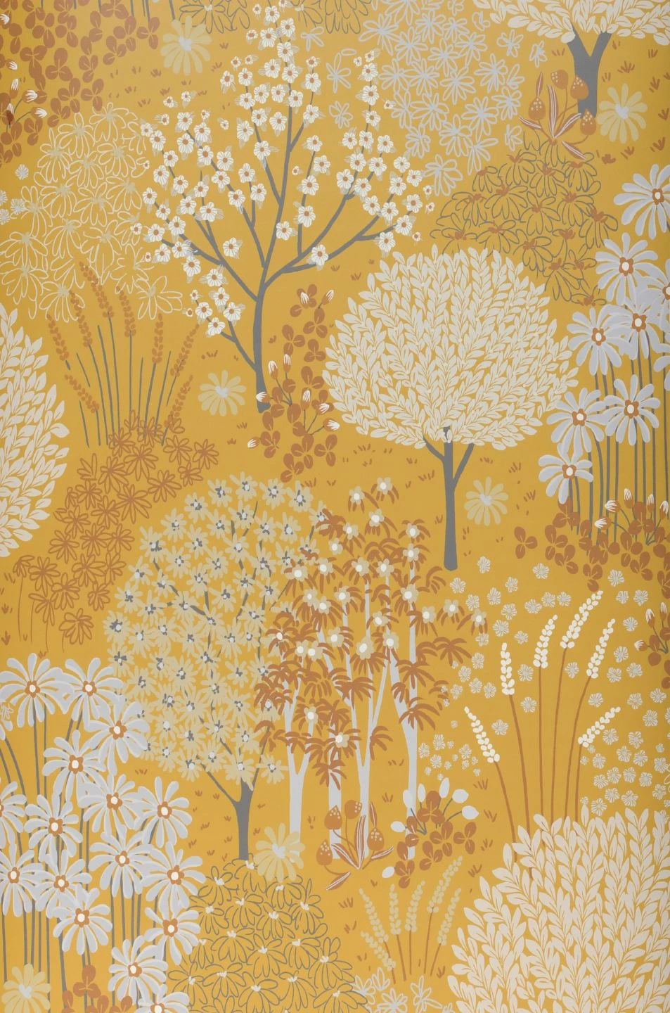 Durchflutet vom Sonnenlicht sind die blühenden Bäume, Blumen und Gräser auf dem goldgelben Grund. Ihre Farben – helle Gelb- und Grautöne und Weiß – tragen zu dem Eindruck eines strahlenden Sommertags bei. Die zarten Farbtupfer, aus denen sich die Pflanzen zusammensetzen, wirken wie handgemalt und machen Aurora zu einer freundlich-sonnigen Kulisse für Ihre Einrichtung im skandinavischen Stil, im Landhaus-Stil oder mit ausdrucksvollen Retro-Möbeln.