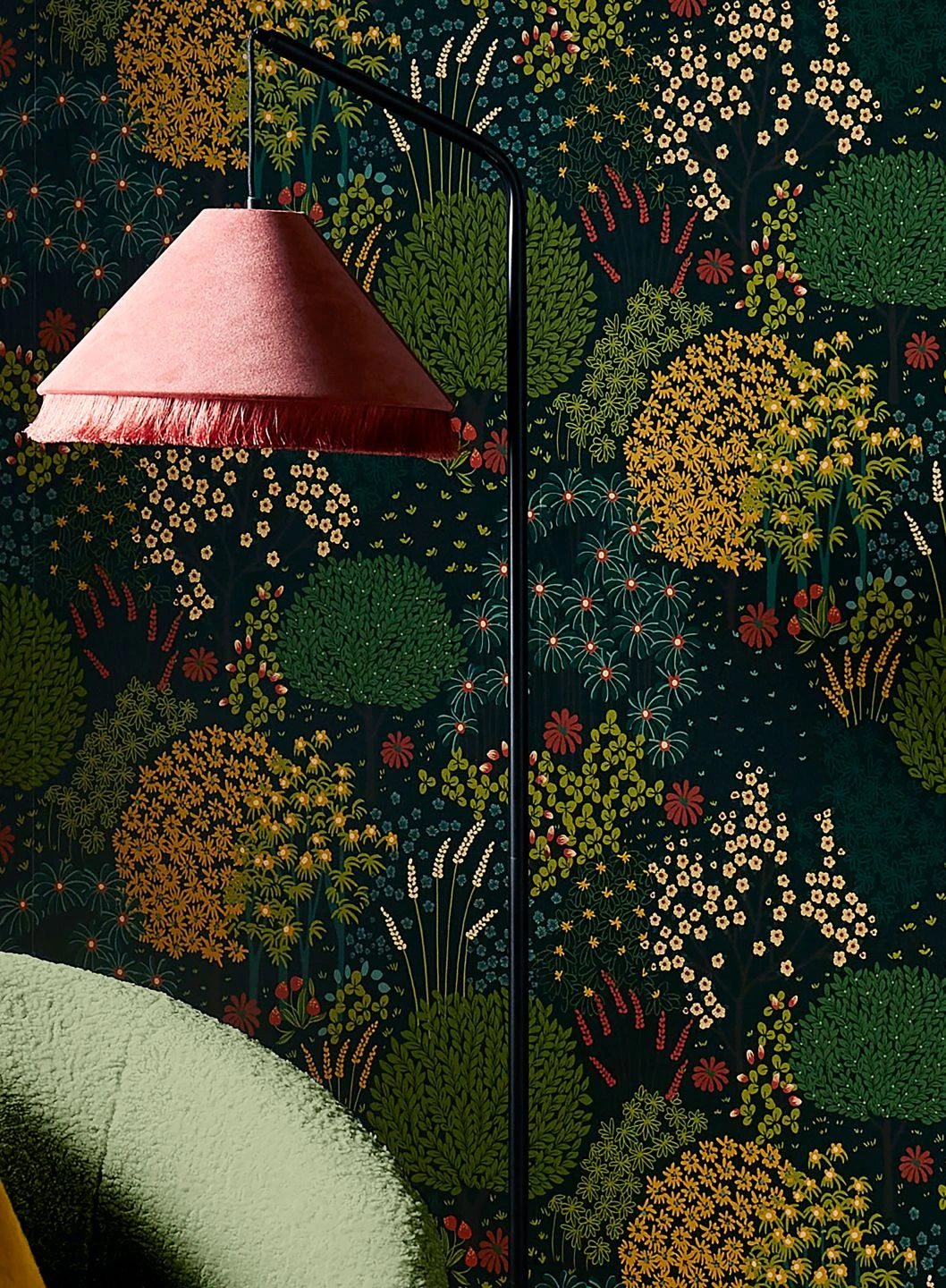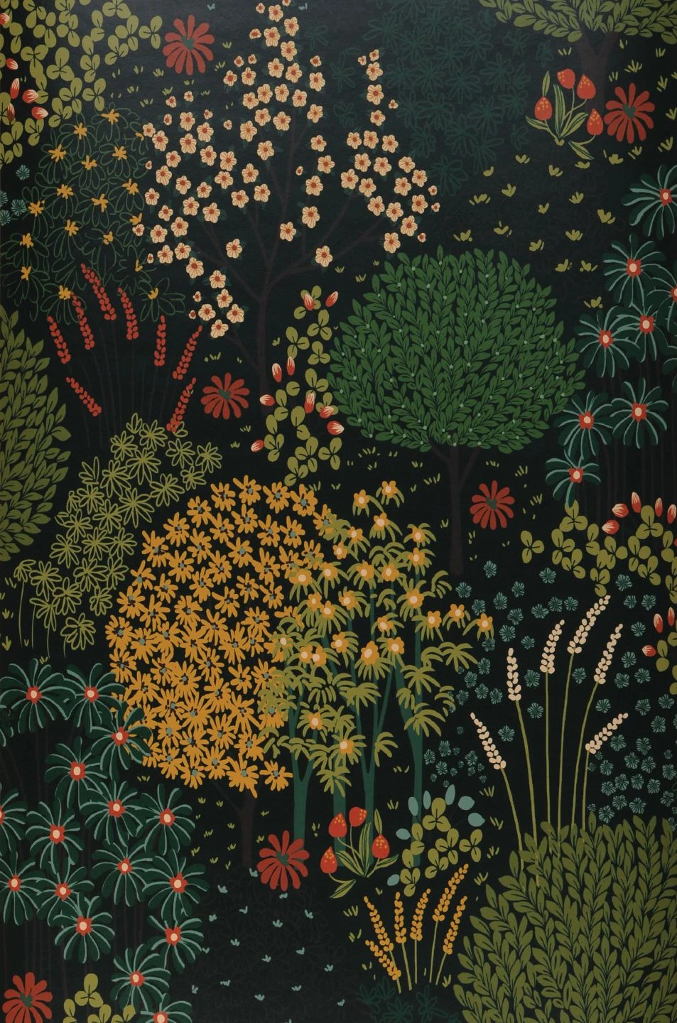Aus feinen Farbtupfern, Linien und Bögen entstehen ganze Bäume voller Blüten, Blumen in den unterschiedlichsten Formen und schlanke Gräser. Dicht an dicht bedecken die wie handgemalt wirkenden Pflanzen den schwarzgrünen Hintergrund. Die Grün-, Rot- und Gelbtöne gewinnen durch ihren Kontrast zum Untergrund noch an Leuchtkraft. Eine außergewöhnliche, farbenfrohe Ergänzung für den Landhaus-Stil, die sich in Wohnzimmer oder Küche gleich gut macht.