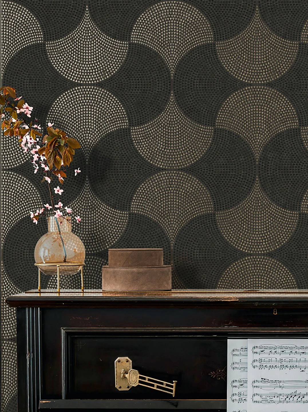 Wie in einem kostbaren antiken Mosaik setzen sich die kleinen mattgoldenen und schwarzgrauen Elemente des Musters zu fächerförmigen Ornamenten im Stil des Art Deco zusammen. Ihre Wände erhalten einen luxuriösen Touch in edlen Farben. Die fein strukturierte Vinyloberfläche der Vliestapete ist hoch waschbeständig, so dass Sie auch Ihr Bad problemlos in den Glamour des Art Deco kleiden können.