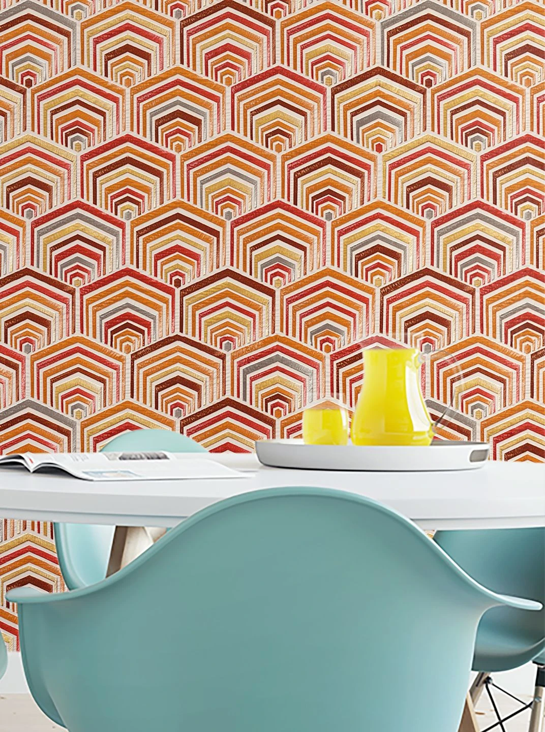 Baccara verbindet ausgefallenes Retro-Design mit der modernen, praktischen Vinyltapete. Die grafischen Elemente, die mehreckige bogenartige Strukturen bilden, erzeugen einen dreidimensionalen Effekt, der durch das verwendete Orientrot, Orange, Braunbeige und Dunkelgrau auf dem hellen elfenbeinfarbenen Grund betont wird. Auch die Beschaffenheit der hoch waschbeständigen Vinyloberfläche unterstützt die fast hypnotische Wirkung durch fein geprägte Schraffuren.
