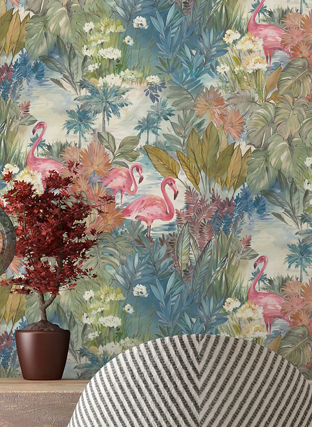 Kräftig altrosafarbene Flamingos, detailreich und realitätsnah gezeichnet, stehen in einer exotischen Landschaft zwischen Palmen, Blattpflanzen und Blumen. Durch geschickten Einsatz der Größenverhältnisse und Farben spielt die Tapete Bahia wirkungsvoll mit Vordergrund und Hintergrund, die sich fast unmerklich vermischen. Farbenfroh und voller Lebenskraft schmückt die Tapete den Raum ihrer Wahl mit ihrem sehnsuchtsvollen Blick in ein fernes Land.
