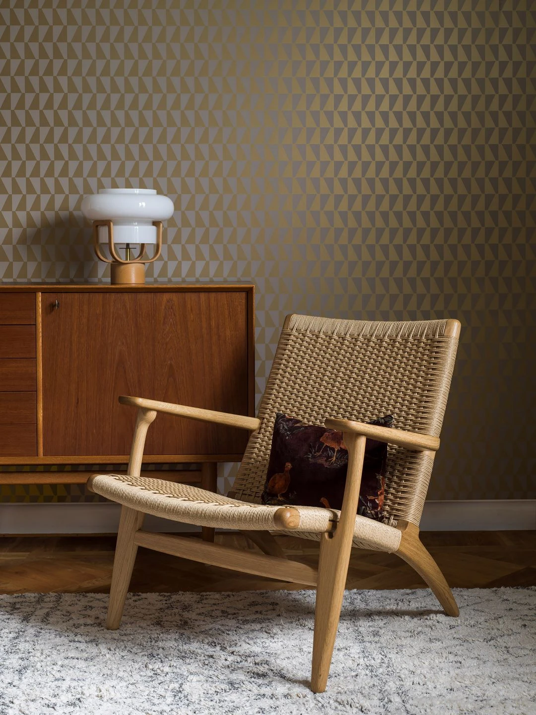 Schimmernd perlgoldfarben und hellgrau sind die Trapeze, die die geometrische Tapete „Balder“ schmücken. Die unterschiedliche Ausrichtung der Formen lässt eine Art von sanft bewegter Wellenstruktur entstehen und belebt Ihren Raum, ohne ihn zu unruhig werden zu lassen. Das Perlgold auf dem neutralen Hellgrau fügt warmen Glamour hinzu und schafft eine edle und gleichzeitig dezente Atmosphäre.