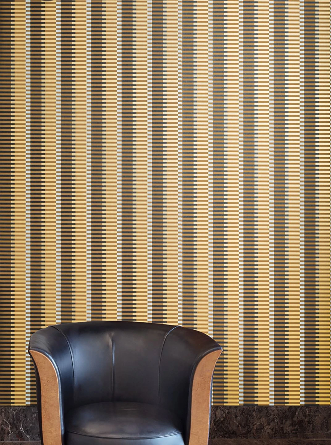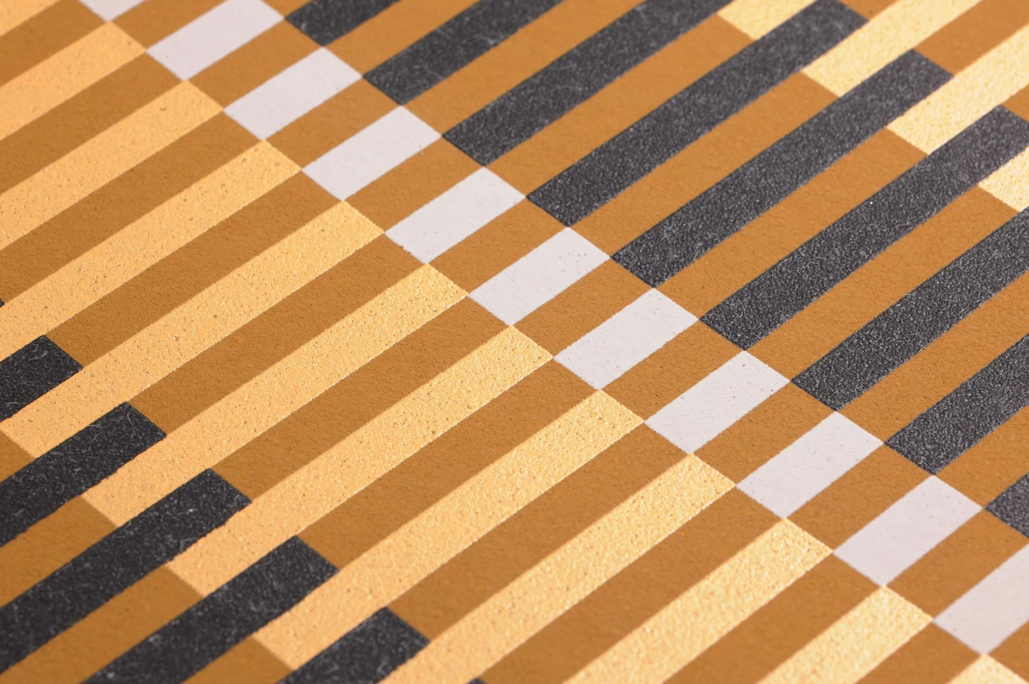 Streifen und Balken in kräftigem Ocker und leuchtendem Gelbgold kombiniert mit Grauweiß und Schwarz lösen die Konturen der Wände auf. Fast psychedelisch spielt die Tapete mit optischen Illusionen und schafft neue Perspektiven. In Kombination mit klaren Linien der Einrichtungselemente ist die exklusive Designertapete ein echter Hingucker. Sie erhalten sie auch in anderen stilvollen Farbkombinationen.