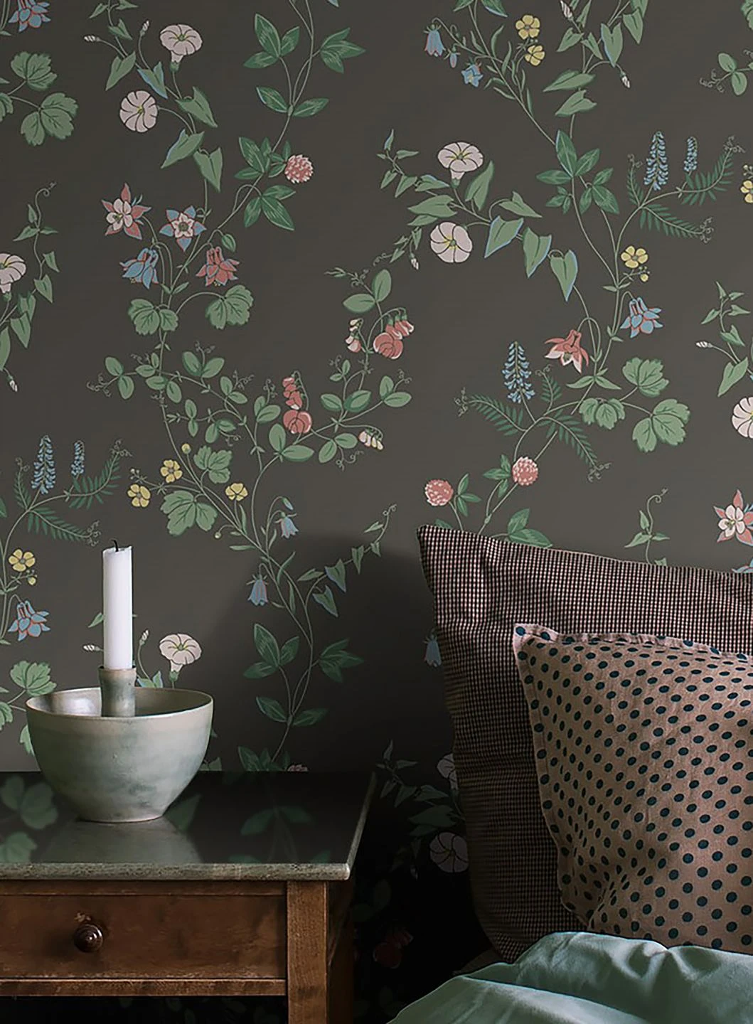 Sommerliche Leichtigkeit kontrastiert mit ruhiger Festigkeit: Die Vielfalt der Sommerblumen in zartem Hellgelb, Hellgrün, Pastellblau und Rosatönen bildet ein luftiges, farbenfrohes Gegengewicht zum Stabilität ausstrahlenden basaltgrauen Untergrund der Vliestapete. Je nachdem, ob Sie mit dunklen Möbeln oder einer der hellen Musterfarben kombinieren, unterstreichen Sie entweder die sommerliche Lebensfreude oder die Solidität, die die Tapete verströmt.