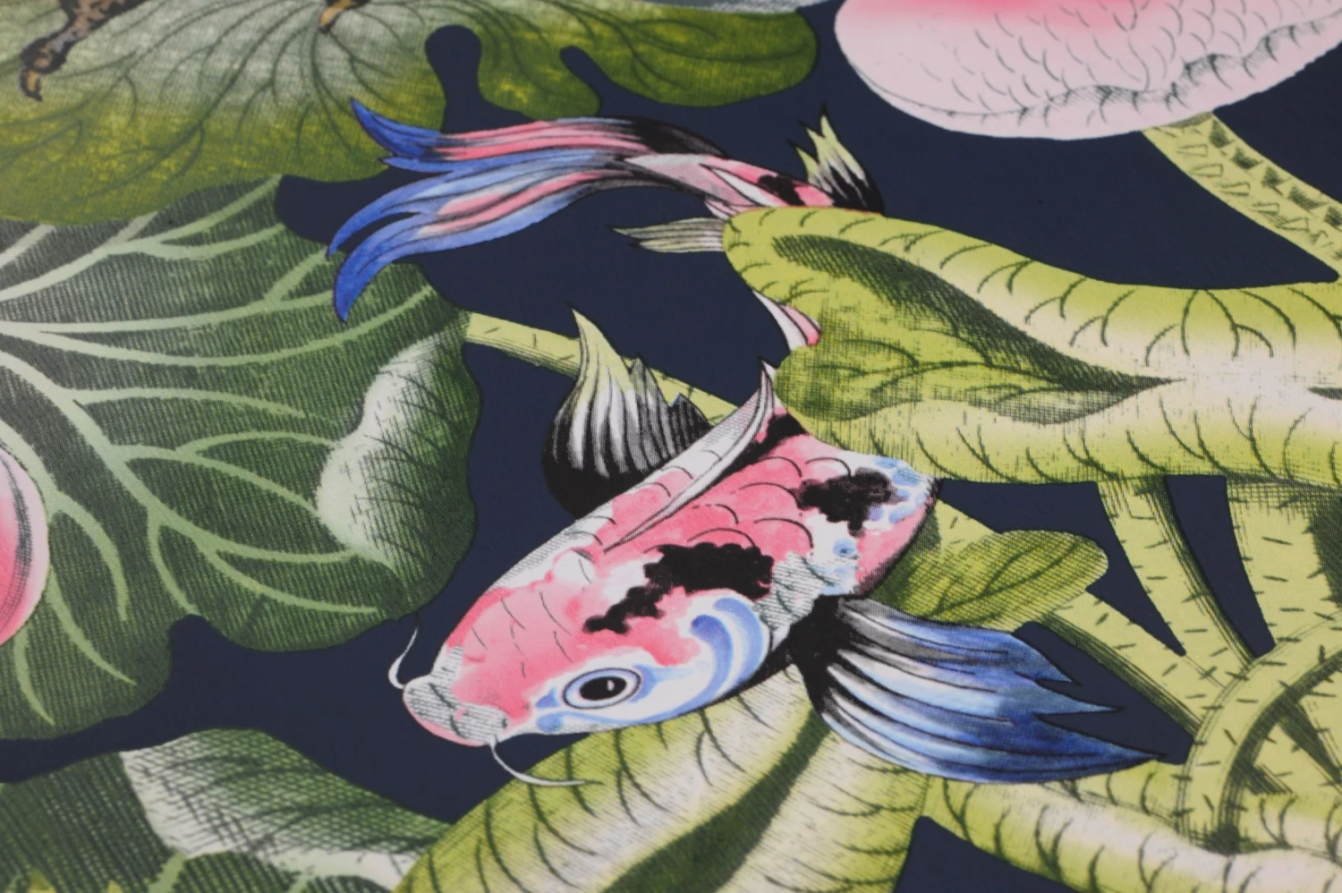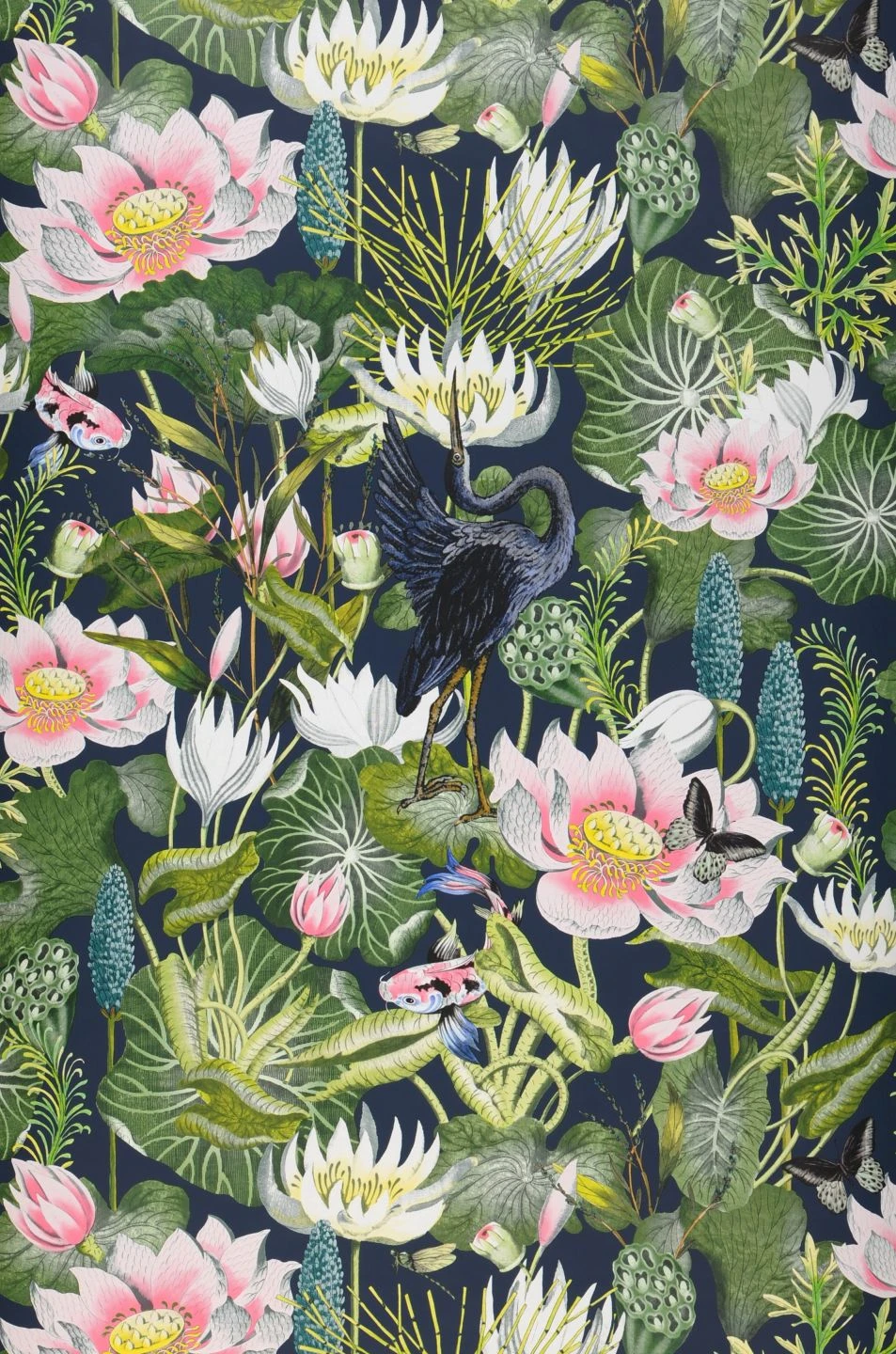Geheimnisvolles, dunkles Stahlblau umgibt die prächtigen rosafarbenen und weißen Blüten von Seerosen und Lotus. Goldfische schwimmen und Schmetterlinge flattern zwischen den üppig wachsenden Wasserpflanzen, fast perfekt getarnt breiten dunkle Kraniche ihre Flügel aus. Vliestapete Bellevue spielt mit den Größen und Dimensionen und bietet eine ausgefallene, orientalisch angehauchte Kulisse voller Leben für Ihren Raum.