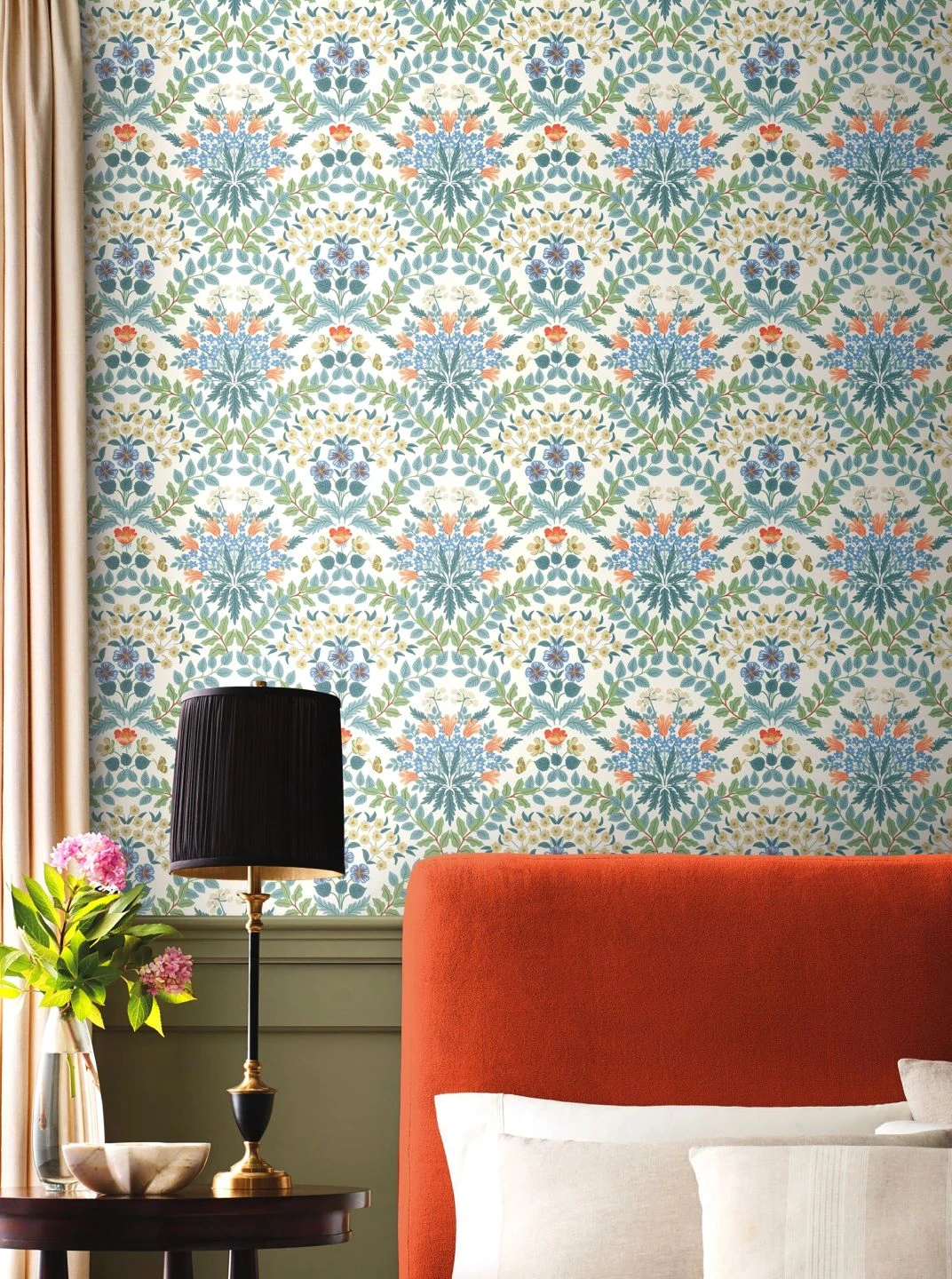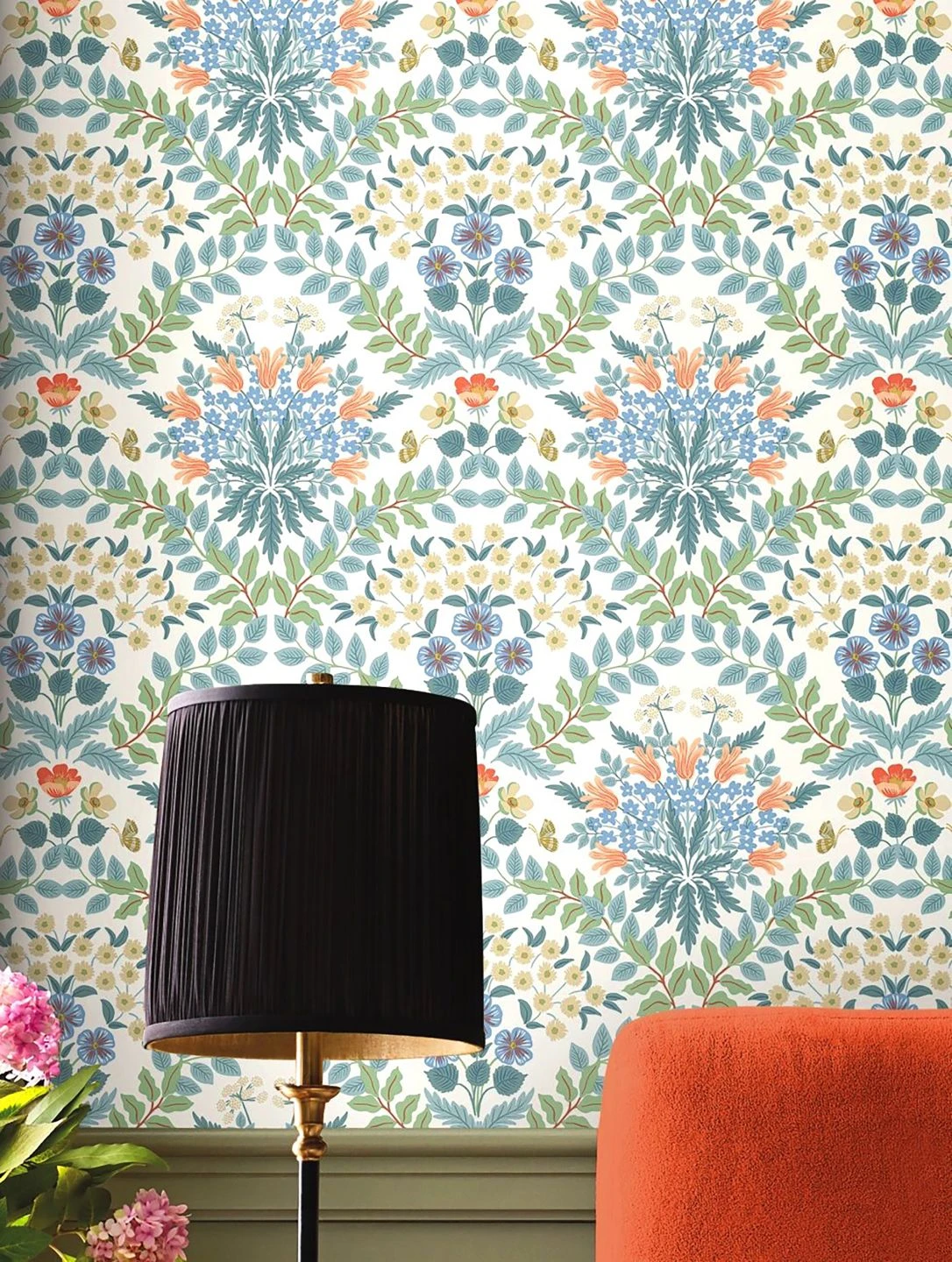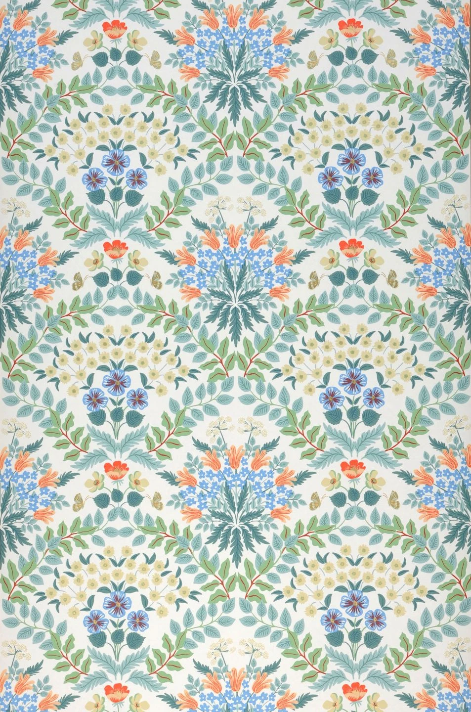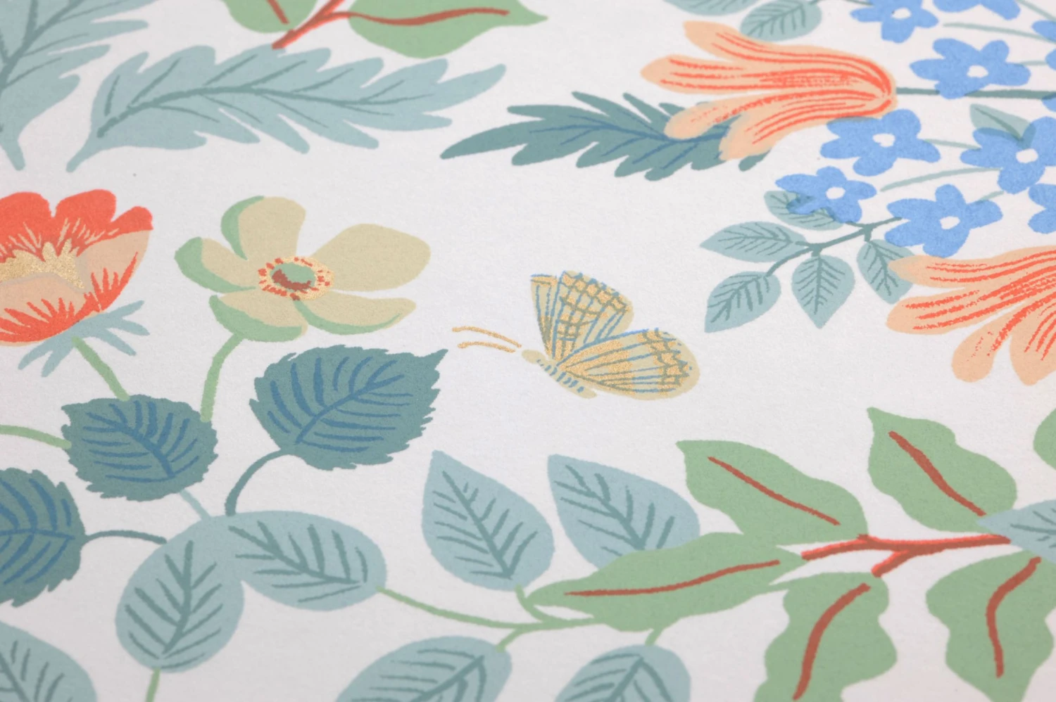 Girlanden aus Blättern formen ein leichtfüßiges Netz aus Grüntönen und umrahmen wunderschön angeordnete Arrangements von Blumen in zarten Blau-, Rot- und Elfenbeintönen. Die Blumentapete von Rifle Paper vereint die klassisch anmutende Aufteilung der Fläche mit Natürlichkeit und der frischen Luftigkeit der bunten Blumen auf cremeweißem Grund zu einem wirkungsvollen Kunstwerk, das Ihren Raum sonnig aufhellt.