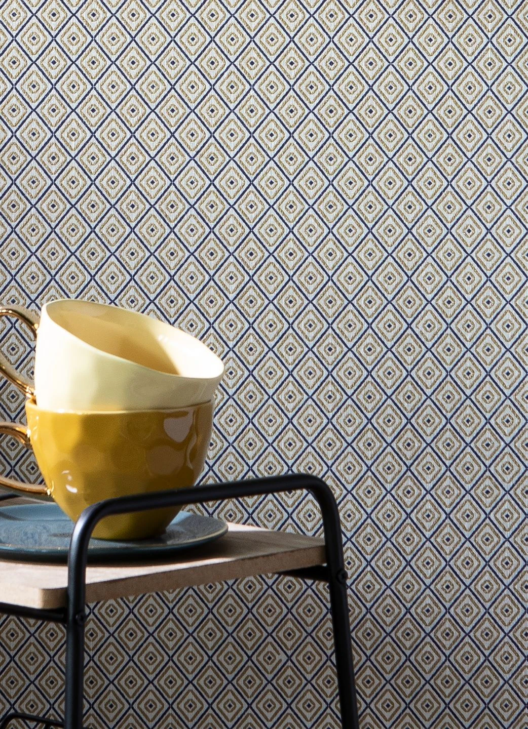 Eine Textiltapete voller Schick ist Calaluna mit ihren edlen Kettfäden, die wie ein feines Relief spürbar sind und den Gewebecharakter betonen. Aus dunkelblauen und weißen Fäden entsteht ein Muster von gleichmäßig angeordneten Rauten. Mattgoldene Fäden heben das Muster hervor und sorgen für einen sanften Schimmer in Ihren vier Wänden. Calaluna verbindet die Wärme und Stabilität des Textilmaterials mit einem Hauch von luxuriöser Eleganz.
