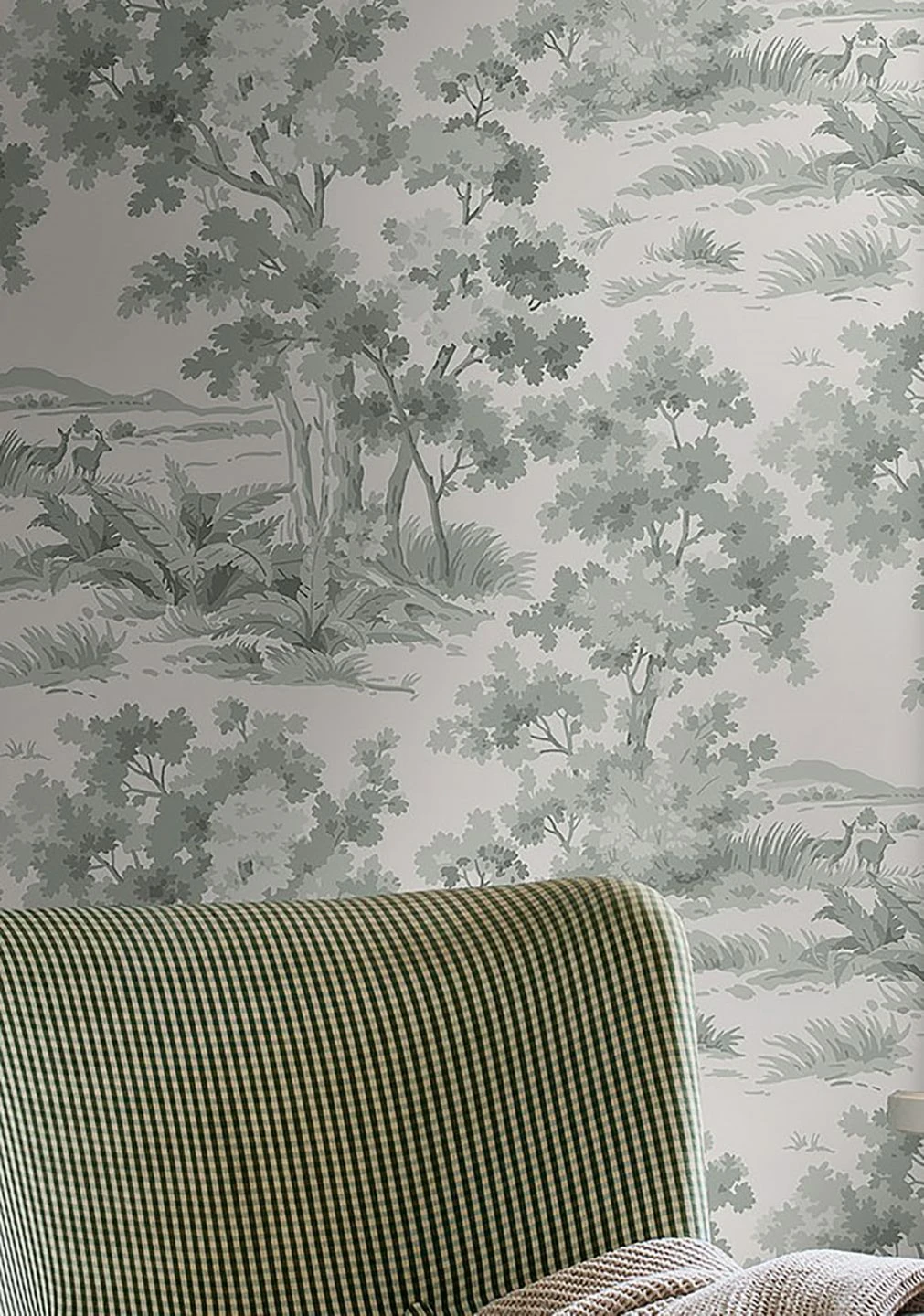 Ganz in verschiedenen Helligkeitsstufen von Mintgrau gehalten, verströmt die Vliestapete „Calobra“ den Charme eines Landschaftsgemäldes, ohne sich durch lebhafte Farben zu sehr in den Mittelpunkt zu drängen. Die dargestellten Wälder, Felder und Rehe bleiben attraktive Kulisse und lassen so vielfältige Kombinationsmöglichkeiten zu. Gerade antike englische Möbel oder eine Einrichtung im Retro-Stil verbinden sich mit der Leimdruck-Tapete zu einer Einheit.