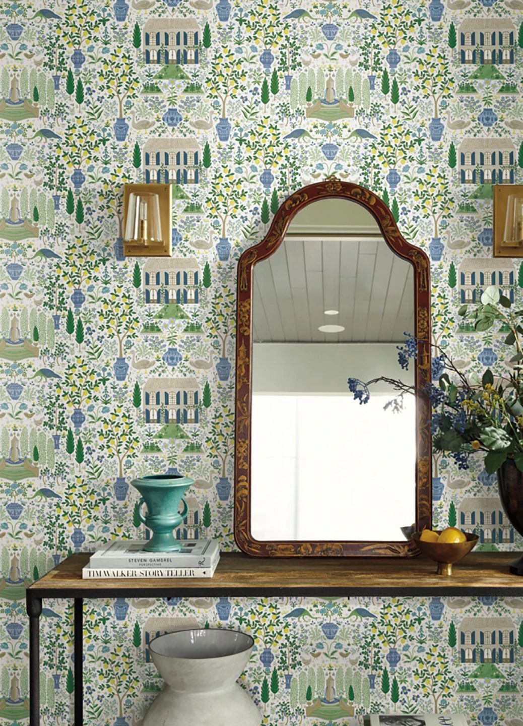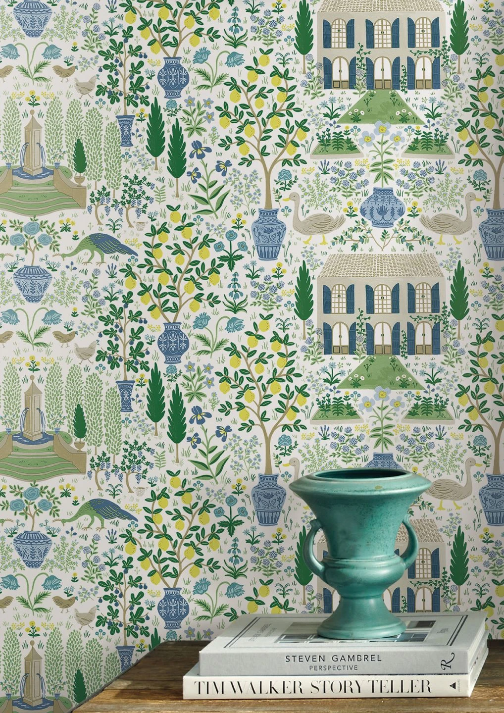 Frische Farben und die Atmosphäre einer Parklandschaft machen den besonderen Reiz dieser Papiertapete aus. Rasen und Blumenbeete, Zitronenbäume in Töpfen und ein Herrenhaus mit einladend geöffneten Fensterläden laden dazu ein, den Blick schweifen zu lassen wie beim Spazieren durch den Park. Durch das Spiel mit der Perspektive und den Größenverhältnissen vermeidet das Design übertriebenen Realismus und bewahrt sich seinen leichten, dekorativen Charakter.