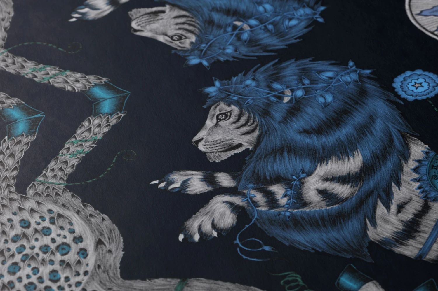 Ein Reigen von geschmückten Fabelwesen erweckt die Atmosphäre eines phantastischen Zirkus zum Leben. Größtenteils in Weiß und Grautönen gehalten, mit Highlights in Grün, Minttürkis und Pastellblau, wirken die Tiere vor dem Hintergrund eines nachtfarbenen Stahlblau wie Erscheinungen in einer Mondnacht. Die magische Atmosphäre verleiht Ihrem Raum einen Hauch von Geheimnis und Phantastik. (Zelda)