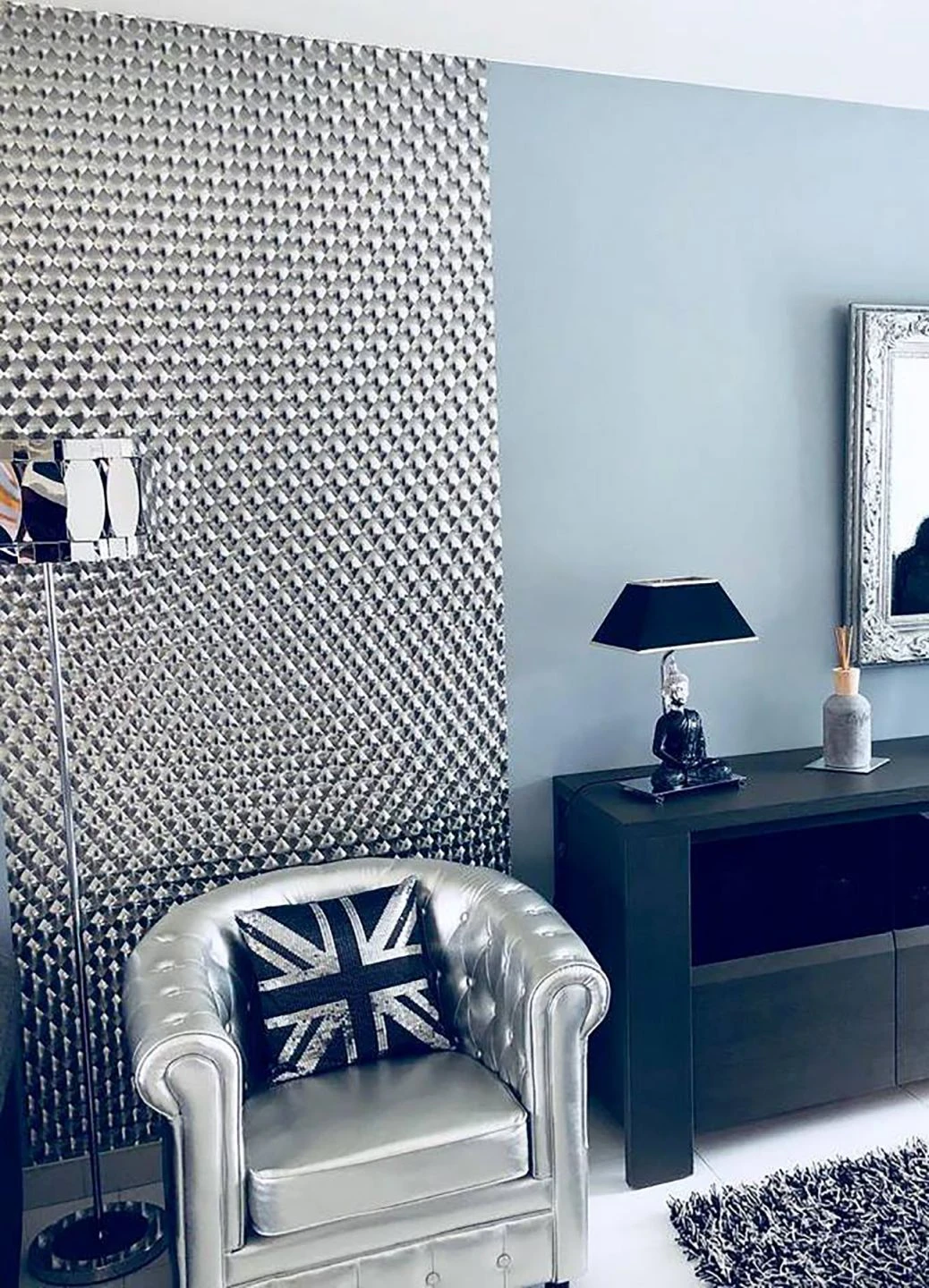 Extravagant und futuristisch wirkt die Metalltapete „Cassiopeia“ durch ihre silbern glänzende Effektfolie, die auf die Vliestapete aufgebracht ist. Der coole Hologramm-Effekt im Rautenmuster löst die Fläche der Wand auf und lässt die Lichtreflexe bis in den letzten Winkel Ihres Zimmers vordringen. Ein Hauch von kühler Science-Fiction-Ästhetik macht Ihren Raum individuell und ausdrucksstark.