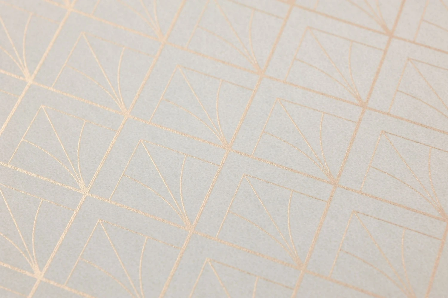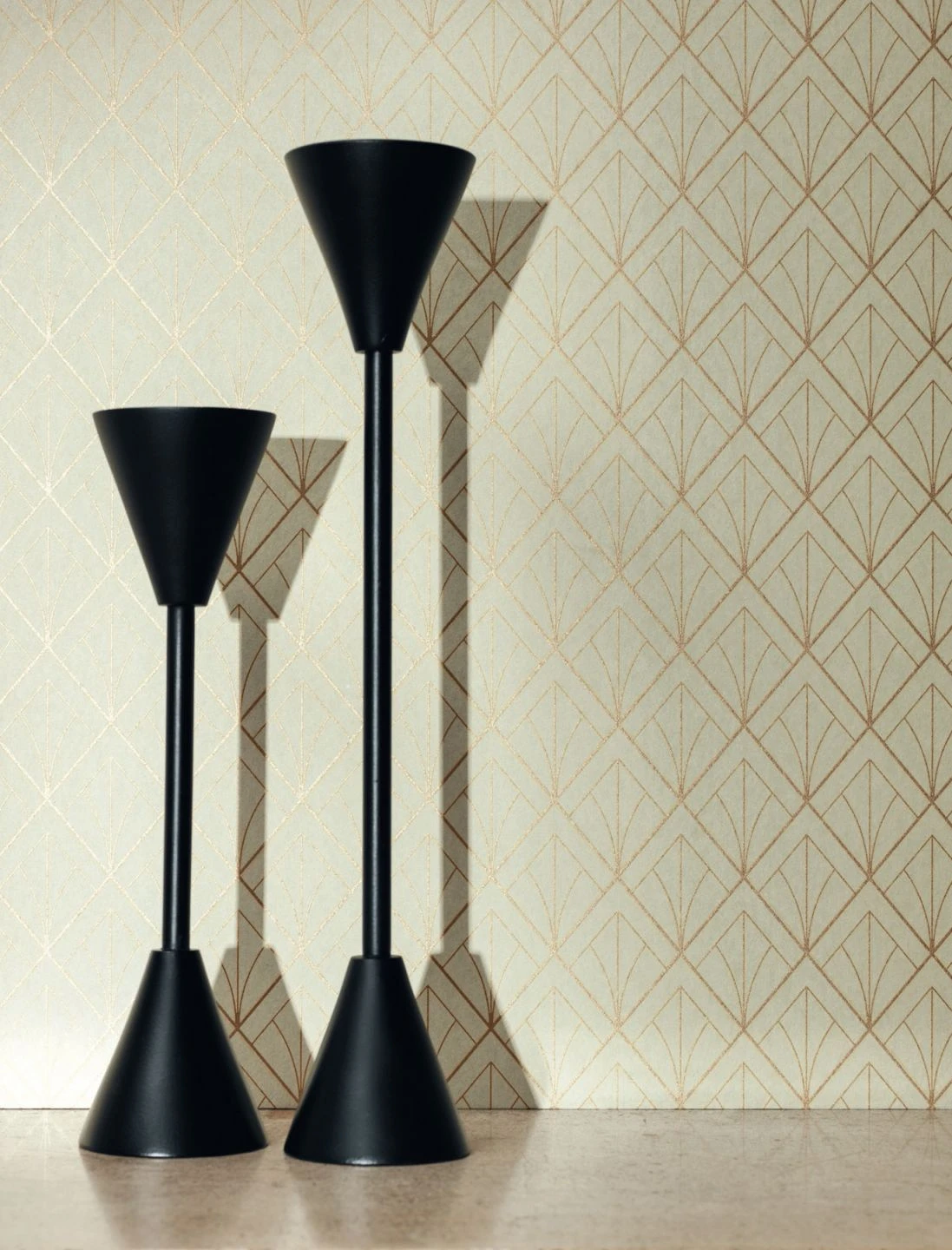 Elegante glatte Formen, perfekte Symmetrie, metallische Farben – Die Art Deco Strömung hat bis heute nichts von ihrem Reiz verloren. In Design Tapete Catriona zeigt sich das geometrische Rautenmuster in Gold, das durch Licht glamourös aktiviert wird. Zusammen mit dem eierschalenfarbenen Grund ergibt sich eine subtile Eleganz für stilvolle Räume.