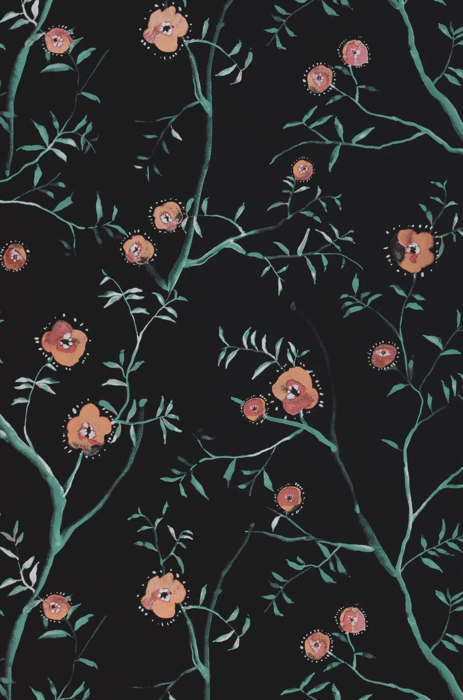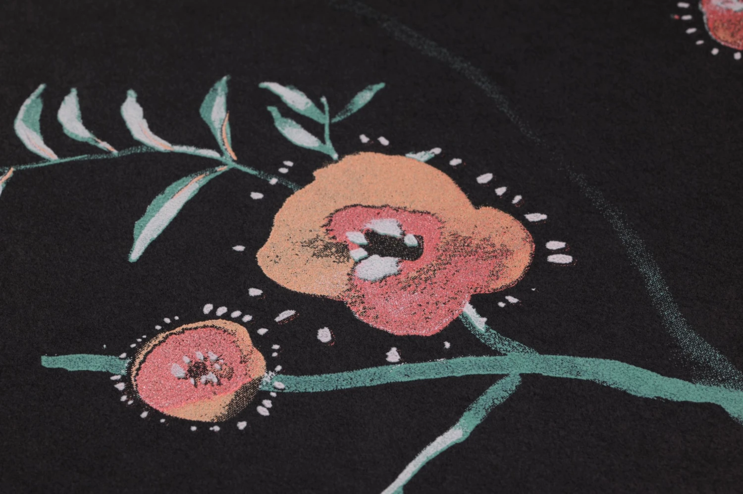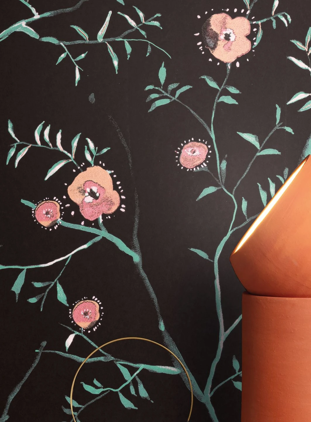 Märchenhafte Blumen, mit wenigen Pinselstrichen angedeutet, entführen Sie jeden Tag ein paar Momente lang aus dem Alltag. Denn auf dem schwarzen Grund wirken sie so, als hätten sie Zauberkräfte. Die locker wachsenden Zweige umgeben Sie in Ihrem Lieblingsraum wie eine schützende, aber durchlässige Hecke. Das leicht schimmernde Rosé der Blüten spielt dabei mit dem einfallenden Licht und bildet einen tollen Kontrast zum Schwarz.