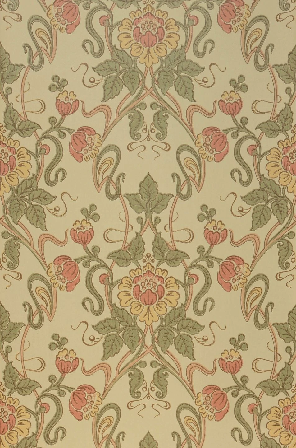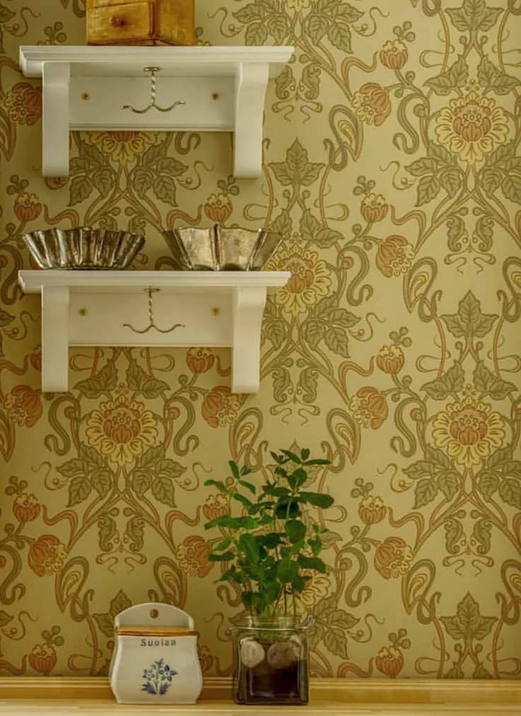 Eine gute Portion Nostalgie zieht mit der aufwändig gestalteten Papiertapete Clothilde bei Ihnen ein: Die Farbgebung mit gedämpftem Beigerot, Pastellorange, Grün- und Brauntönen wirkt zusammen mit dem grünbeigen Grund und den typischen Blüten und Blattranken des Jugendstils und erzeugt den Eindruck einer antiken Kostbarkeit. Hinzu kommt das Leimdruckverfahren, das den Wert der Handarbeit ausstrahlt. Welche Tapete könnte Ihre antiken Möbel wirkungsvoller in Szene setzen?