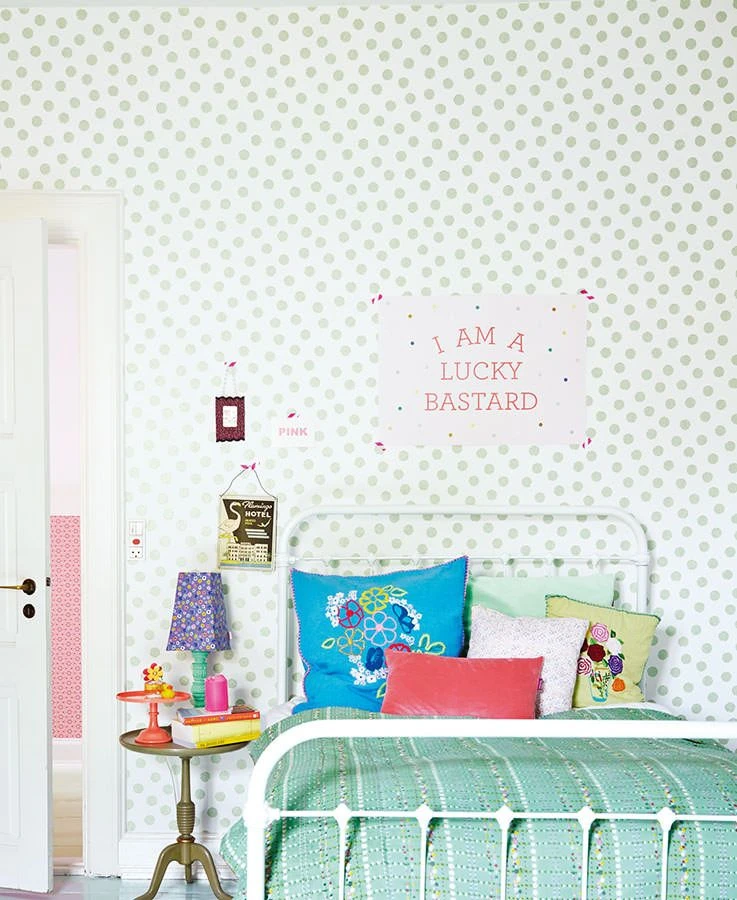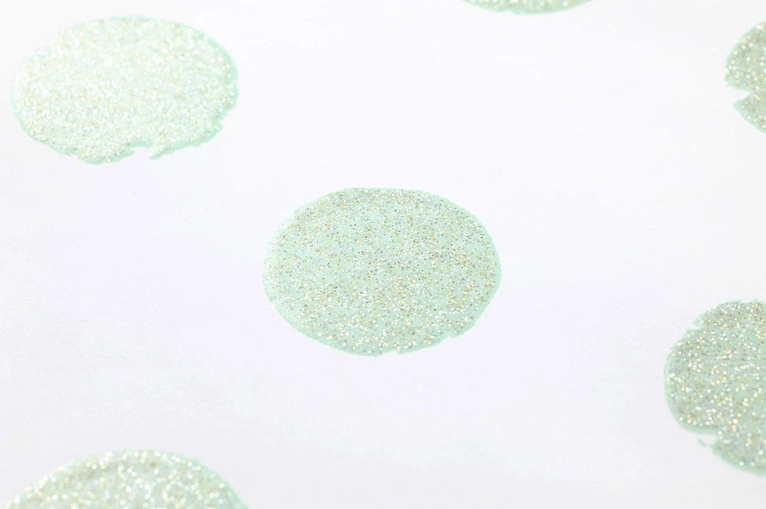 Punkte in frischem Pastellgrün mit Glitzereffekt sorgen hier für Leichtigkeit und Lebendigkeit. Sie sind als fühlbares Relief in die Oberflächenstruktur der Vliestapete eingearbeitet und heben sich sowohl optisch als auch haptisch angenehm vom cremeweißen Untergrund ab. Den Kombinationsmöglichkeiten sind keine Grenzen gesetzt: Andere Pastellfarben oder verschiedene Grüntöne geben ein schönes Bild. Oder Sie betonen den Glitzereffekt mit weiteren glanzvollen Deko-Elementen.