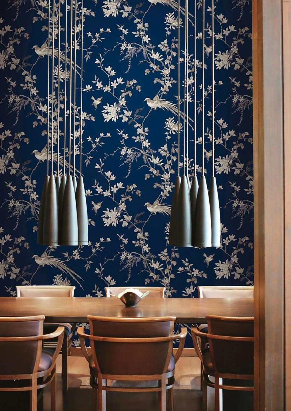 Das märchenhafte Design und der Zauber von Weiß, hellen Grautönen und silbernem Schimmer auf dunkelblauem Grund verwandeln Ihren Raum auf faszinierende Weise. Die Vögel mit fantastischen Schmuckfedern auf blühenden Zweigen strahlen die scheinbar mühelose Eleganz der asiatischen Kunst aus. Das traditionelle Leimdruckverfahren, in dem die Vliestapete hergestellt wurde, trägt zum edlen, hochwertigen Eindruck von Coringa bei.