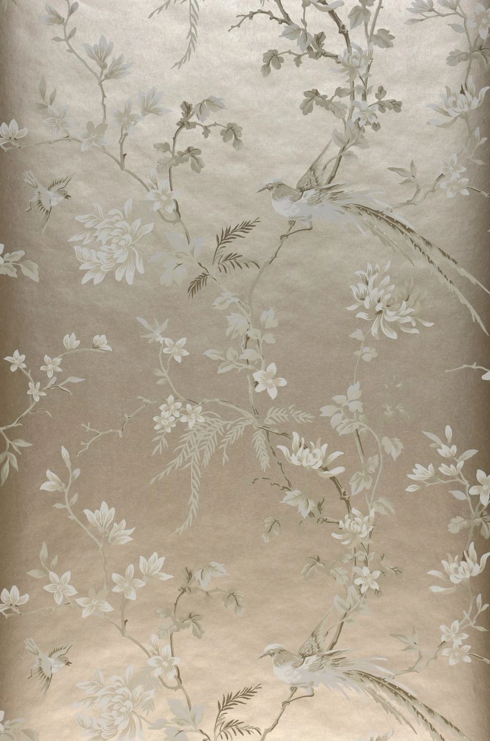 Seidig schimmerndes Perlbeige bildet den Hintergrund für Zweige voller Blüten und Blätter, auf denen Vögel mit prachtvollem Gefieder sitzen. Die eng miteinander und mit der Grundfarbe verwandten Grau-, Creme- und Brauntöne sowie Weiß sind im Leimdruckverfahren auf den schimmernden Grund aufgetragen und wirken dadurch besonders hochwertig. Die elegante Tapete im orientalischen Stil wertet Ihren Raum auf dezente Weise auf.