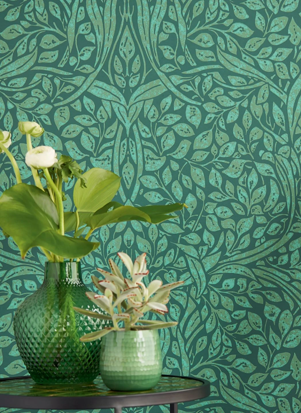 Blätter verschiedener Art und Größe verschmelzen nach Art des Jugendstils zu einem dichten Lianen Dschungel. Farn- und Kieferngrün wirken authentisch. Die glatte Vliestapete in Leimdruckoptik, mit abwaschbarer Oberfläche, heißt Gäste willkommen oder verwandelt Wohn- und Aufenthaltsräume in grüne Oasen.