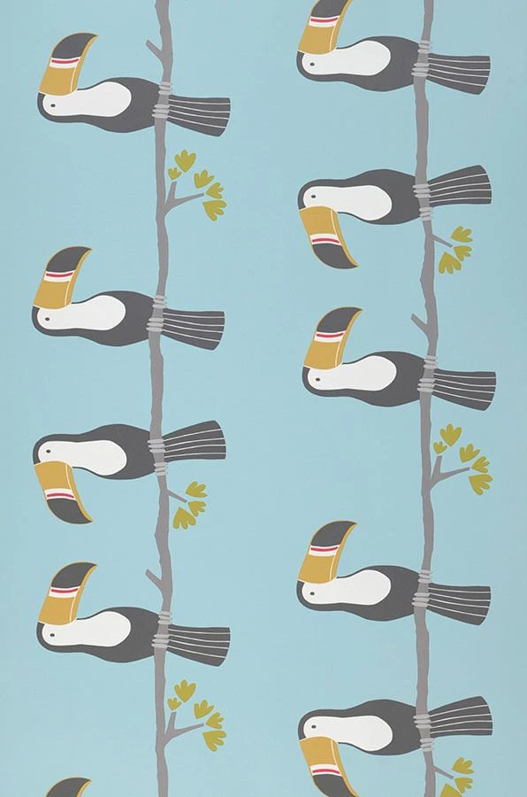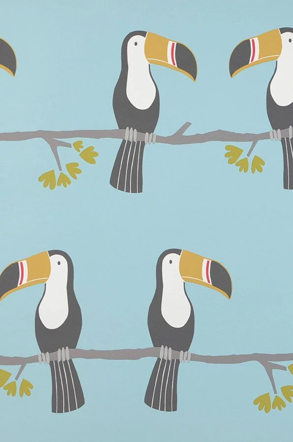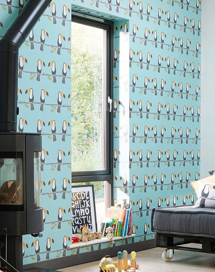 Tukane, diese beeindruckenden Vögel mit ihren großen farbenfrohen Schnäbeln, gehören sicher zu den Lieblingsvögeln vieler Kinder. Auf dieser Papiertapete stehen die exotischen Vögel, freundlich und liebevoll gezeichnet, im Mittelpunkt. Der Hintergrund in strahlendem Pastelltürkis leuchtet wie die Farbe des Sommerhimmels und löst so die Fläche der Wand auf. Den Kombinationsmöglichkeiten sind keine Grenzen gesetzt.