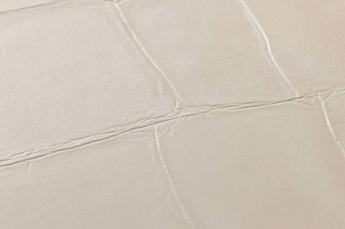 Die große, schuppenartige Narbenstruktur in einem eleganten hellen Elfenbeinton sorgt für die Anmutung echten Krokodilleders. Die Narben sind als fühlbares Relief in die Oberfläche aus Vinyl eingearbeitet, die gleichzeitig hoch waschbeständig ist und dadurch auch für ein schickes Badezimmer verwendet werden kann. Die Leder-Imitation bietet einen geschmackvollen Hintergrund beispielsweise für dunkle Holzmöbel.