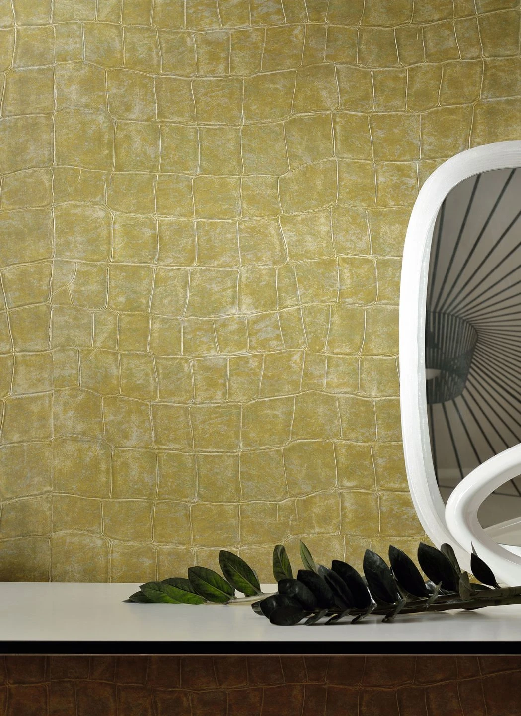 Die Natur entwirft die schönsten Muster und Farbspiele – So wie bei dieser Lederimitat Tapete in Krokodesign. Das sanfte Trio aus Olivbraun, Olivgrün und goldenen Akzenten verleiht der haptischen Vinyloberfläche einen Hauch von Retrochic wie ihn die Prominenz im sonnigen St. Tropez liebt. Verwirklichen Sie Looks, die Exklusivität im Stil der unkonventionellen Seventies verkörpern.