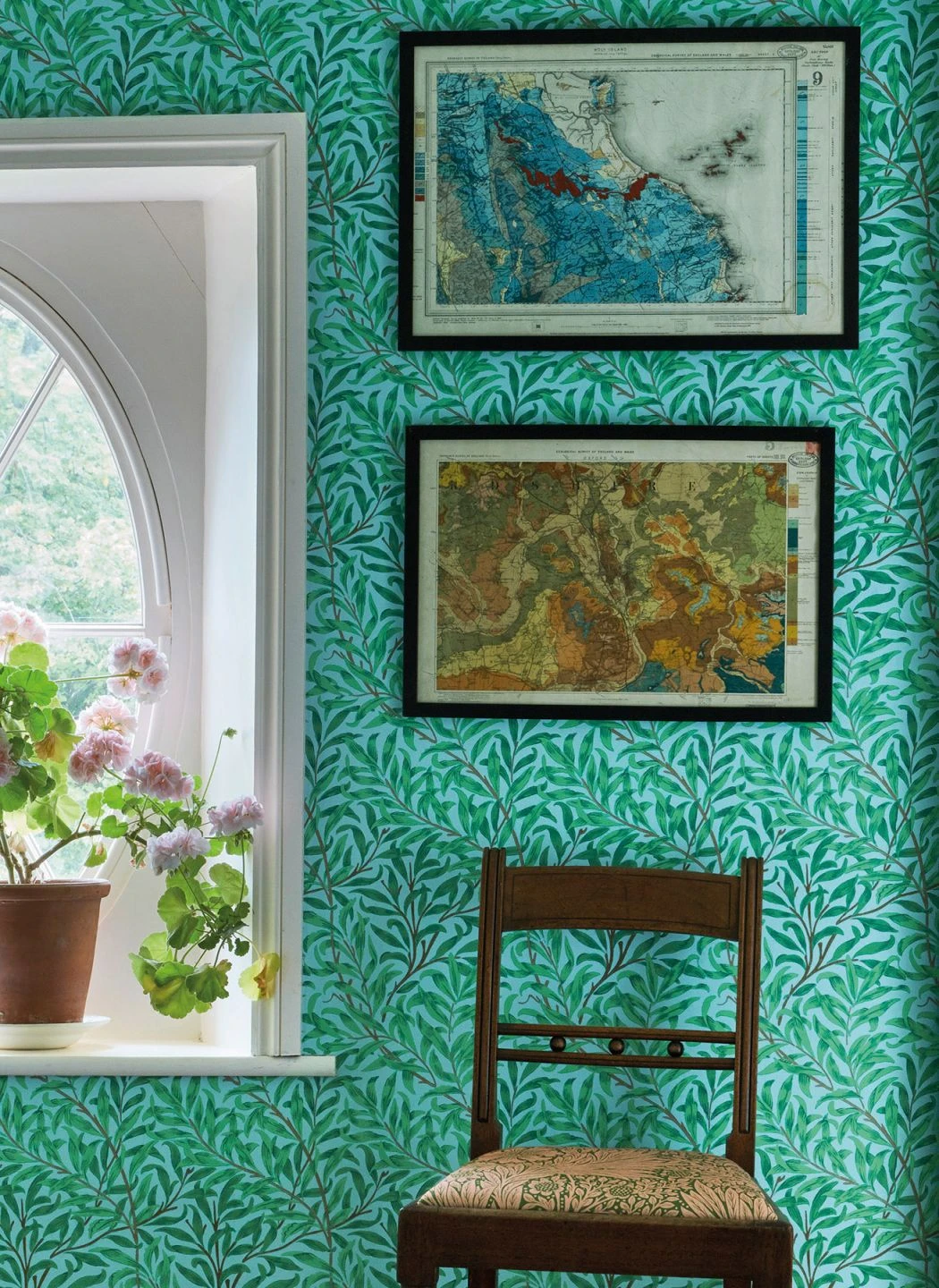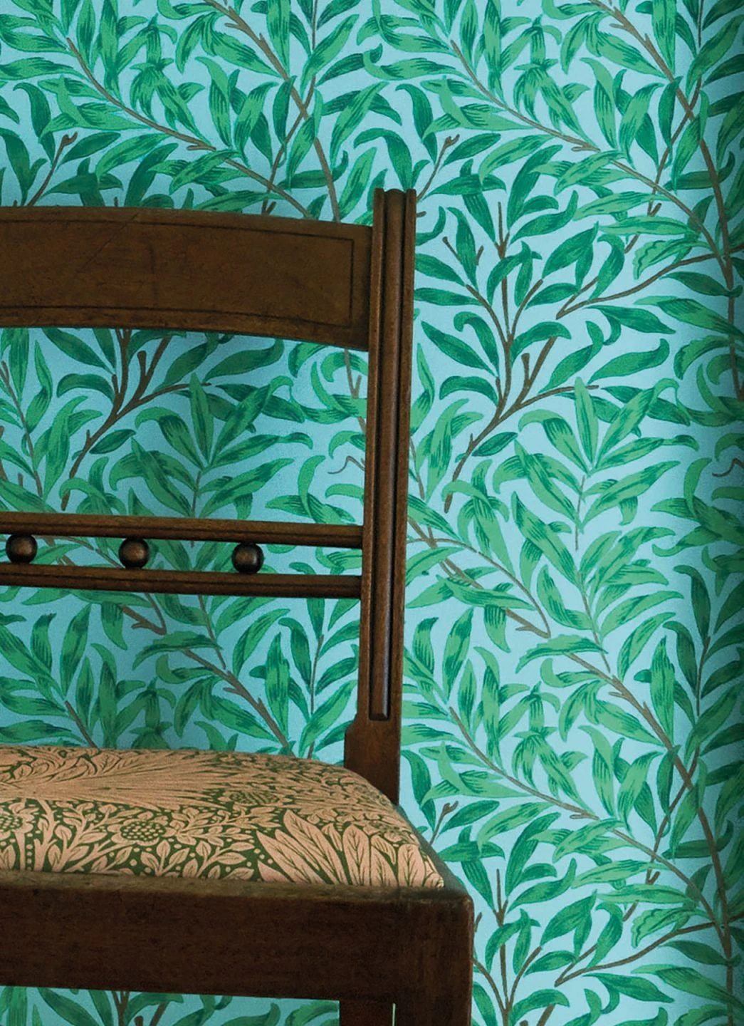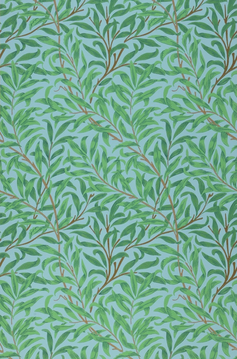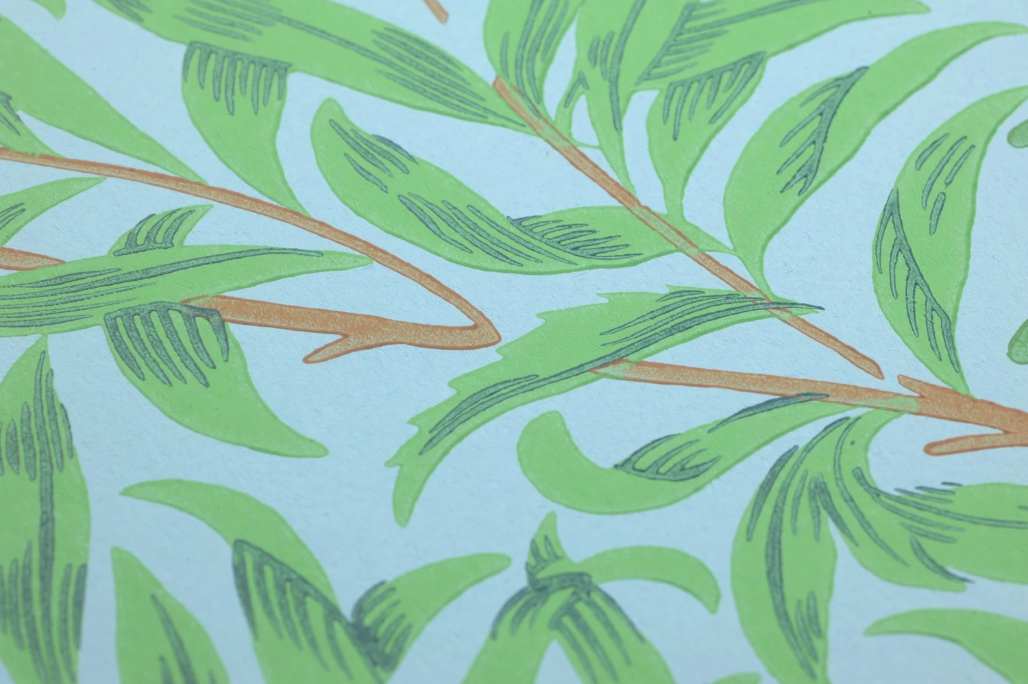 Schlanke, schmale Weidenblätter an biegsamen Zweigen bilden ein verschlungenes Geflecht. Aus dem Zusammenspiel der Grüntöne mit dem hellblauen Hintergrund entsteht eine geheimnisvoll gedämpfte Lichtstimmung wie in einem Gebüsch. Das nostalgisch anmutende Design wurde im traditionellen Leimdruckverfahren auf die Papiertapete aufgebracht, so dass sie das besondere Charisma handgefertigten Wandschmucks ausstrahlt.