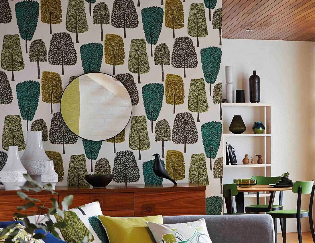 Stilisierte Laubbäume stehen dicht an dicht in einem freundlich-hellen Laubwald. Die Baumkronen und verschieden geformten Blätter symbolisieren die Vielfalt der heimischen Bäume. Von leuchtendem Grüngelb über Olivgrau bis hin zu Türkisgrün reicht die Farbpalette. Die Blätter scheinen mit Stempeln in die Baumkronen gestempelt. Eine gelungene Mischung aus Naturnähe und Stilisierung, die sich mit Holztönen oder einer der Musterfarben bestens verträgt.