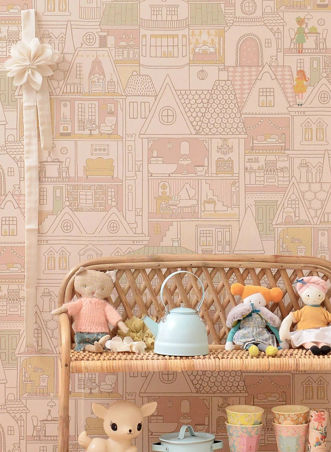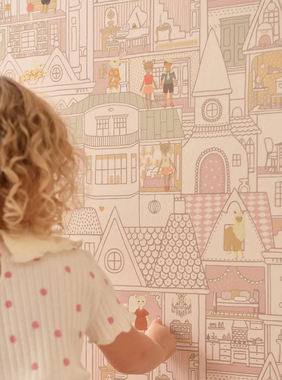 Diese Kinderzimmer-Tapete von Majvillan ist nie ganz fertig! Denn mit den passenden Aufklebern ziehen Bewohnerinnen und Bewohner in die wie Puppenhäuser offenen Häuser der abgebildeten Stadt ein. Ihr Kind gestaltet die Tapete aktiv mit und wird dabei kreativ und phantasievoll zum Spielen und Geschichtenerzählen ermuntert. Die Aufkleber sind mehrfach verwendbar und hinterlassen auf der Tapete keine Rückstände.