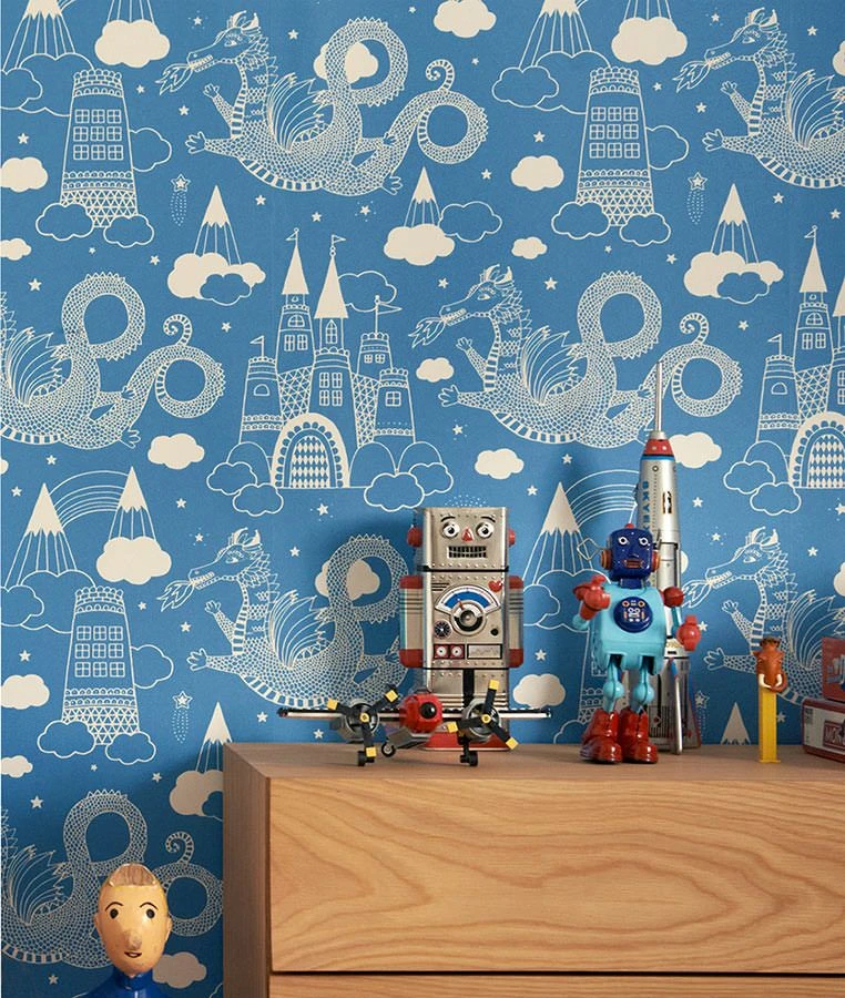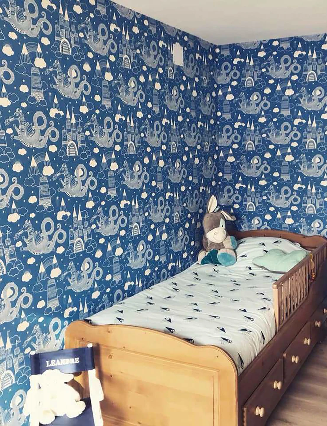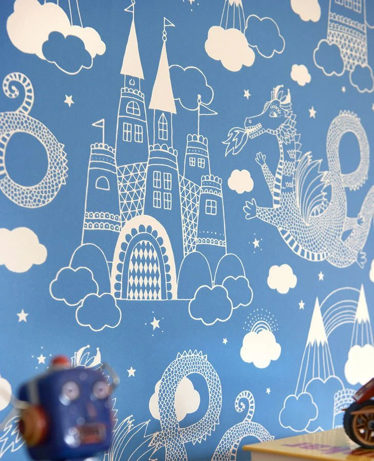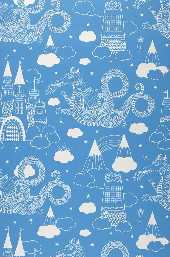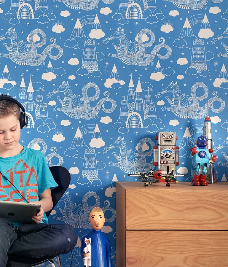 Das weiße Muster aus fantasievollen Elementen der Drachenwelt wird durch den himmelblauen Fond deutlich hervorgehoben. Die spielerisch-inspirierende Designertapete lockt den Blick immer wieder auf das Geschehen und regt zu spannenden Gedankenreisen ein. Für Jungs oder Mädchen ist die waschbeständige Vliestapete mit Leimdruck-Optik gleichermaßen ein Highlight.