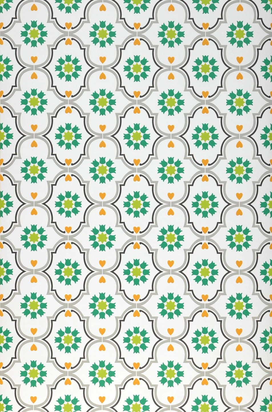 Vintage-Tapeten dürfen alles – auch mal barocke Muster sehr frei und mit schrillen Farben interpretieren. So wie Efigenia, die bewusst auf die Musterfarben Gelbgrün, Grün, Moosgrau, Orange, Schwarzgrau setzt und damit einen frischen Charakter beweist. Sie ist ein echtes Highlight in Ethno-Küchen, im Ankleidezimmer oder auch im Flur.