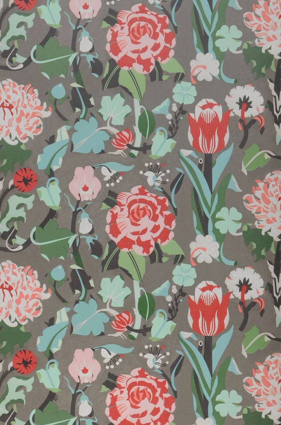 Blumen mit großen Blüten in Rot- und Rosatönen schaffen ein lebendiges Ambiente mit positiver Ausstrahlung. Die flächige, stilisierte Darstellung der Blüten und Blätter verleiht ihnen große Ausdrucksstärke, und auf dem quarzgrauen Untergrund entfalten die Farben eine besondere Strahlkraft. Vliestapete Eleonore schafft eine Verbindung zwischen dem traditionellen floralen Tapetendesign und aktueller Ästhetik.