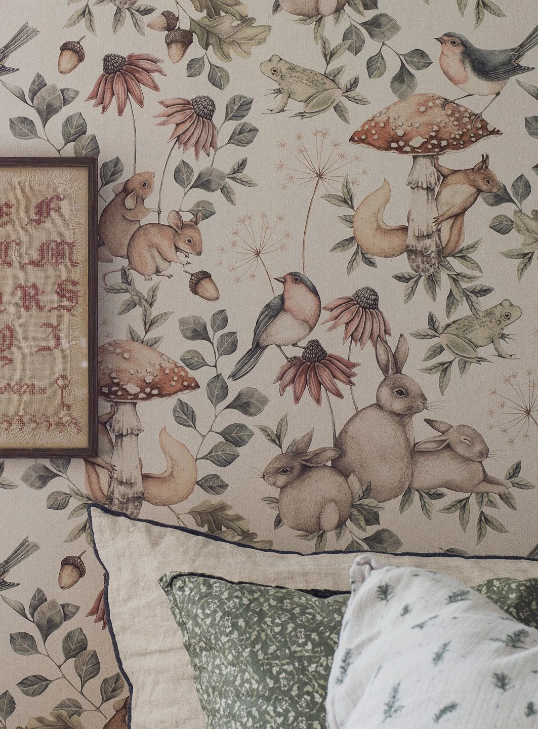Ein kleines Idyll breitet sich mit Vliestapete Elsa auf Ihren Wänden aus und macht jedes Kinderzimmer zu einer Oase der heilen Welt. Zwischen Zweigen, Blumen und Pilzen sind liebevoll und niedlich gezeichnete Tiere zu entdecken, darunter Kaninchen, Eichhörnchen und Rotkehlchen. Die Tapete regt die Vorstellungskraft Ihres Kindes an und lässt die Erinnerung an den letzten Besuch im Wald lebendig bleiben.