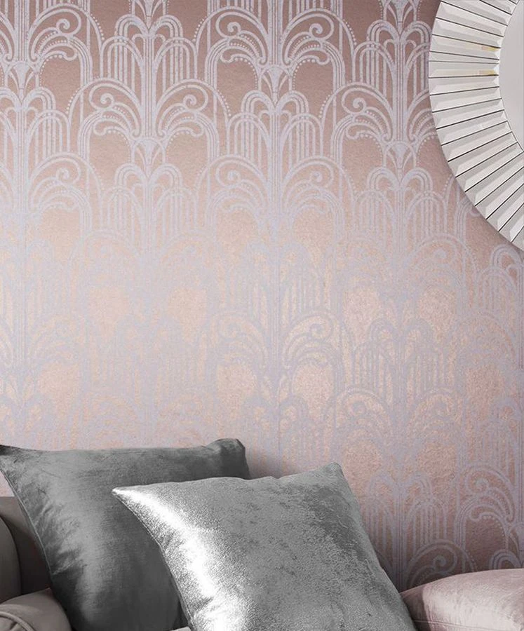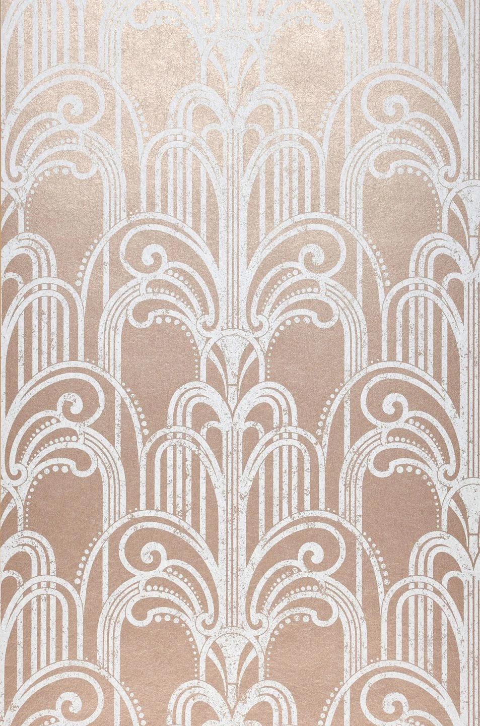 Pure Eleganz von geheimnisvoller Schönheit – Prickelnde Champagnerbrunnen bilden das suggestive Muster der Art Deco Tapete, die für entspannte Stunden geradezu prädestiniert ist. Der schimmernde Untergrund in Beigerot-Perlglanz setzt das Weiß des Musters je nach Lichteinfall neu und glänzend in Szene.