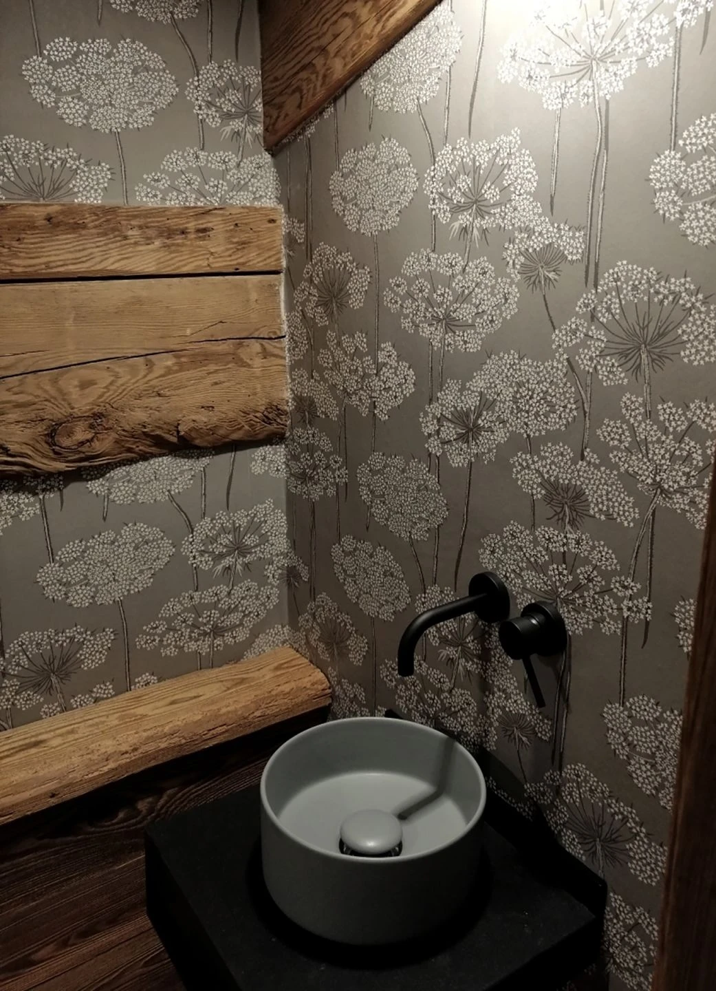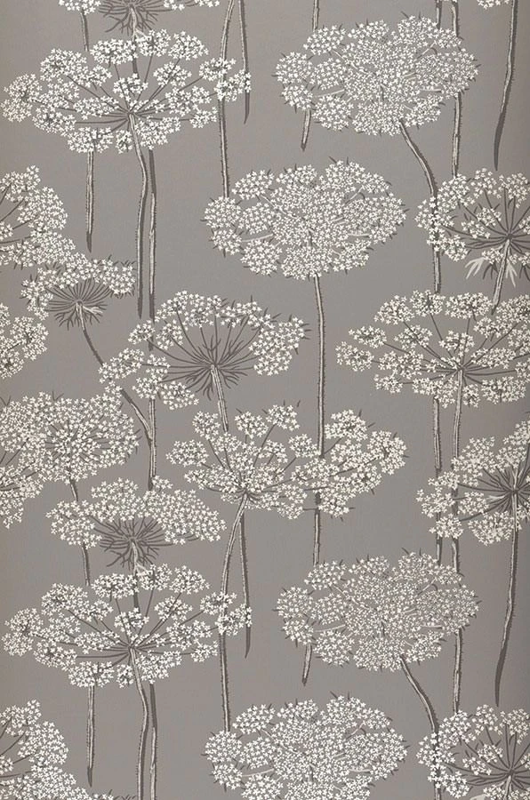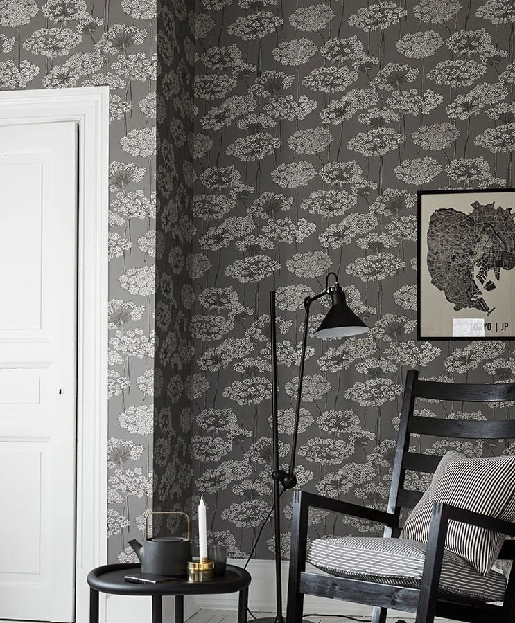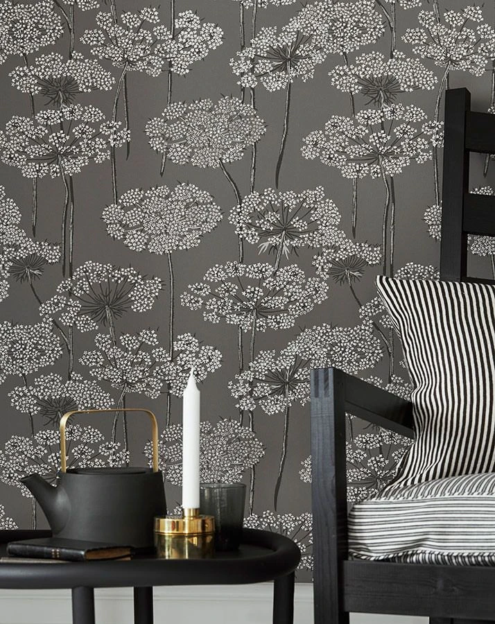 Große, ausladende Blütendolden ruhen auf schlank aufragenden Stängeln und präsentieren ihre zierlichen weißen Blüten wie kleine Sterne. Die Non-Colours Anthrazit, Grauweiß und Hellgrau auf dem grauen Grund lassen die Vliestapete harmonisch und ruhig wirken. Möbel in Schwarz, Weiß oder Grautönen ergänzen sie prachtvoll, aber auch kräftige Farben ergeben im Kontrast zu den Grautönen ein schönes Bild.