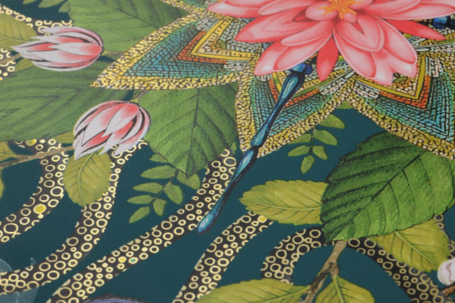 Zugleich realitätsnah in ihrer Detailfülle und abstrakt im symmetrischen Arrangement der Motive ist Vliestapete Evolutia. In schimmernd bunten, hellen Farben auf dem blaugrünen und ozeanblauen Grund sind prächtige Lotusblüten und frische grüne Blätter, Kraniche mit dunklem Gefieder und Libellen mit ihren zerbrechlich wirkenden Flügeln, Schlangen und kräftige Leoparden zu einem fesselnden Design vereint, das Ihren Raum mit seiner exotischen Note belebt.